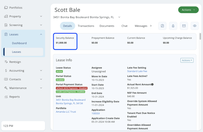 - Once the charge is paid, the lease will show that there is a held security deposit.