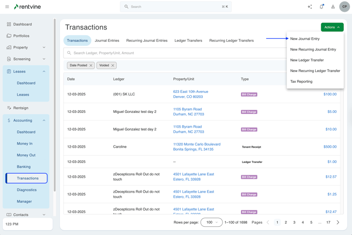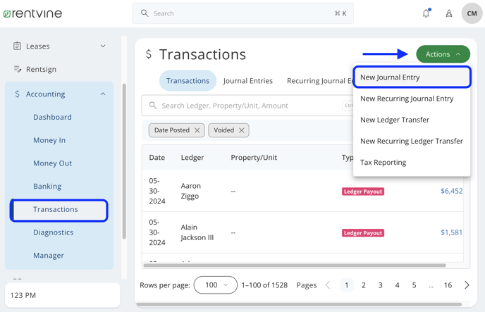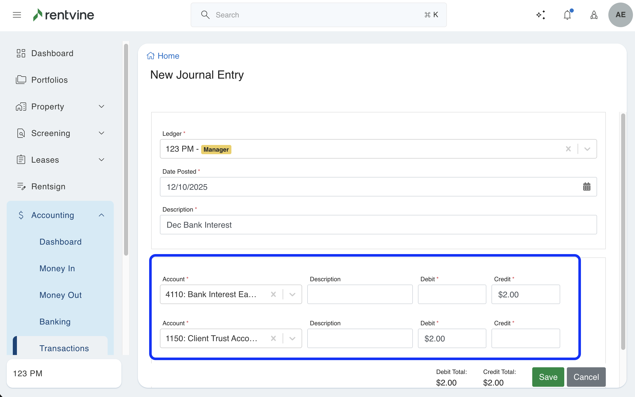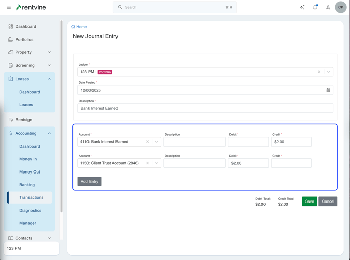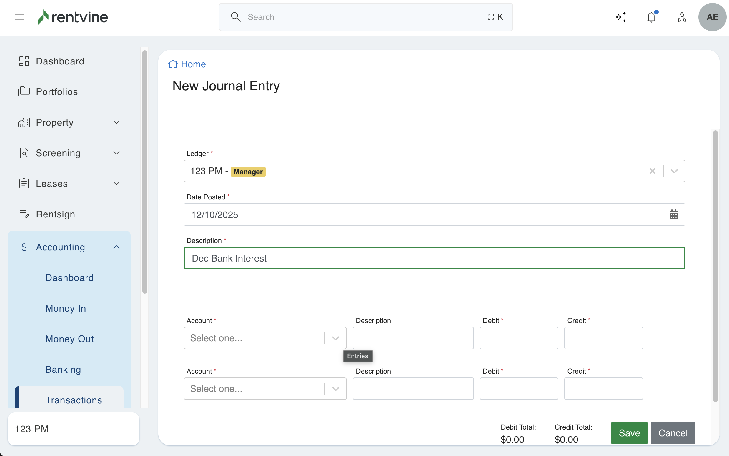 If you receive interest on one or more of your trust accounts, the best way to enter that into your Rentvine account is through a Journal Entry. Follow the steps below to show that you have received interest. Please note that there are two modes within Rentvine. The typical flow will be through Bill Mode, but Manager Ledger Mode is included in this article as well.