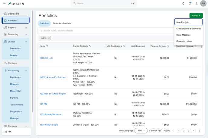 - Next, you will need to make sure you have a portfolio created for your property management company. This is to create a ledger that you can tie money to, but not affect the portfolio balance of your owners. To create a portfolio, click on the portfolios tab, click the green actions button, and click "New Portfolio". You will just need this as a placeholder, so you can also make an owner contact for the property management company.