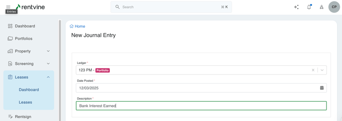 - In the New Journal Entry screen, complete the fields to record the interest earned