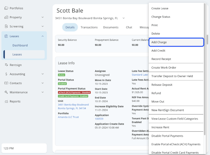 - On the lease, use the green actions button "Add Charge". Use your normal security deposit chart of accounts.