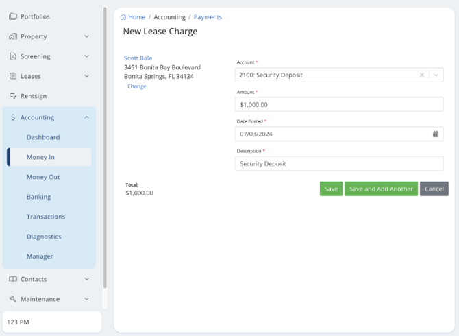 - Once the tenant pays the security deposit charge that was just created, you can move on to the next steps. The tenant can pay this via the portal, or the property manager can record the manual payment (check, cash, money order)