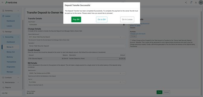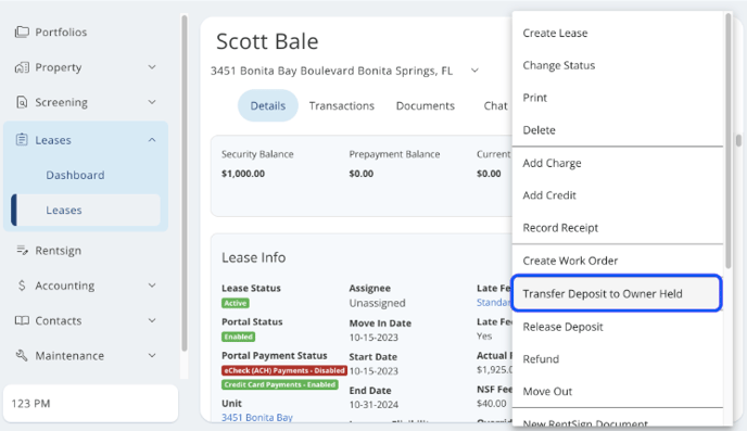 - From the lease, use the green actions button and select "Transfer Deposit To Owner".