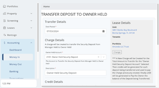 Please note that this is only when you want to record the deposit as being owner-held and still managing the current lease. If you want to forfeit the security deposit to the owner when completing the move-out, then please follow the forfeiting the deposit to the owner.