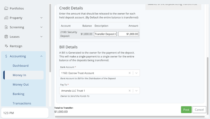 - Choose the owner you are paying the Security Deposit to and hit "Post."