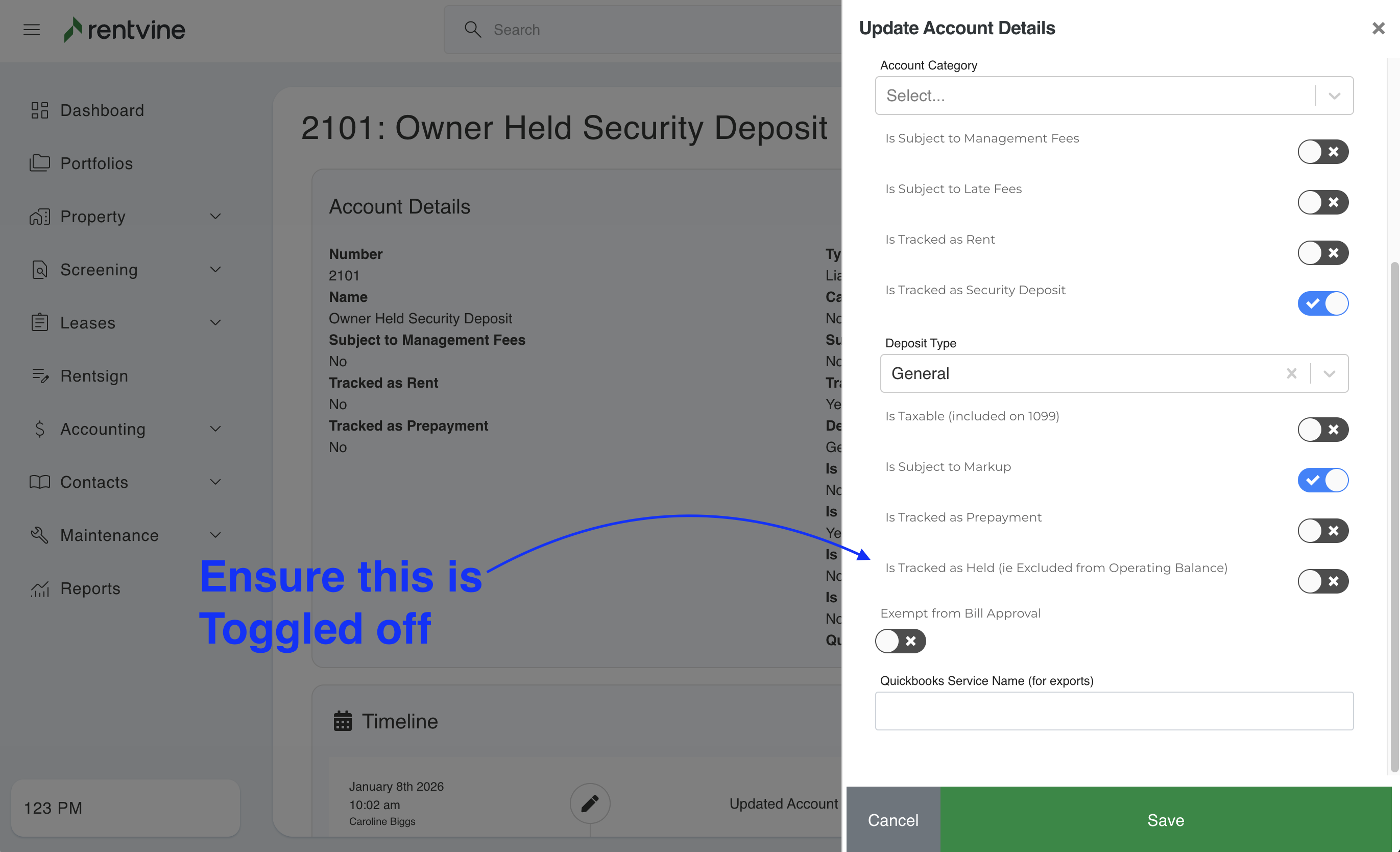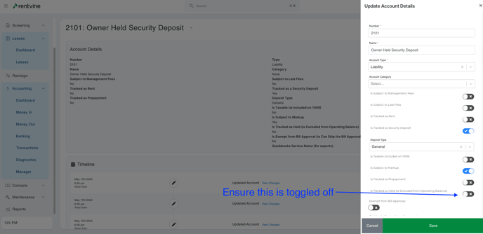 - Before following the rest of this article, you will need to create or check that you have a liability chart of account called "Owner Held Security Deposit" (ensure that the option "is Tracked as Held" is toggled OFF and "is Tracked as Security Deposit" is toggled ON). If you need to create this account, follow this article on How to Create a Chart of Account