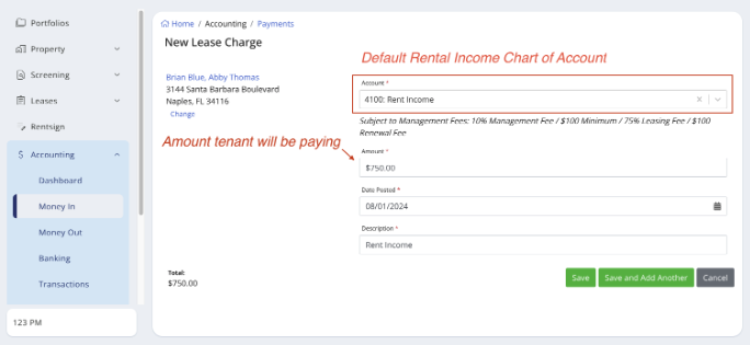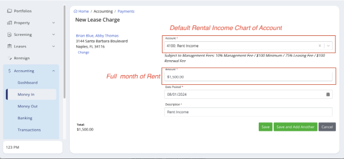 1. Record one rent Lease Charge for the amount that the tenant will be paying using the default Rental Income Chart of Account.