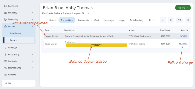 1. Scenario #1: Both the tenant payment and the Section 8 payment are allocated to a single rent charge on the lease.