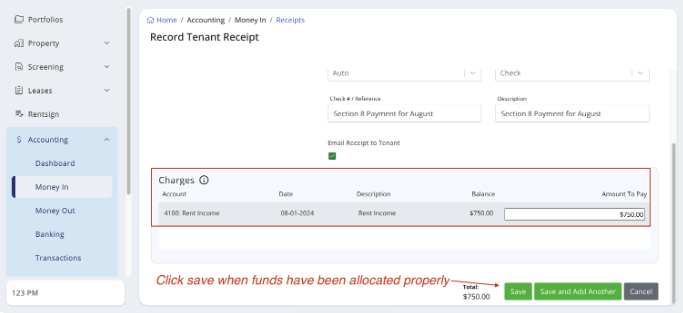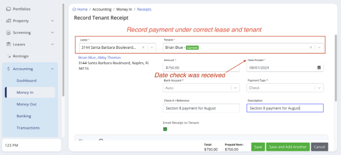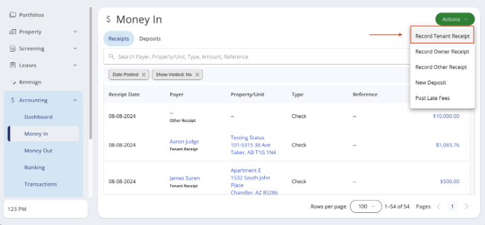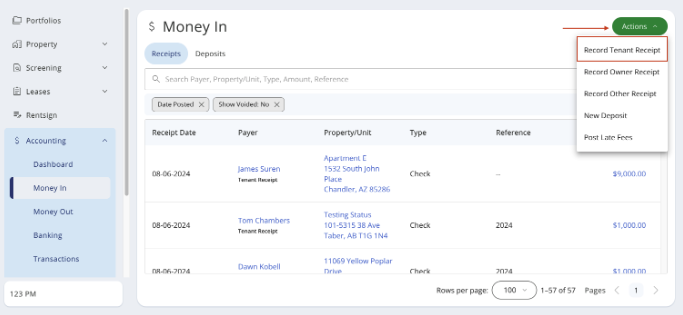 2. Record the Section 8 payment as a tenant receipt by going to Accounting > Money In > Green Actions Tab > Record Tenant Receipt or by going to the lease and clicking the Green Actions Button> Record Receipt.