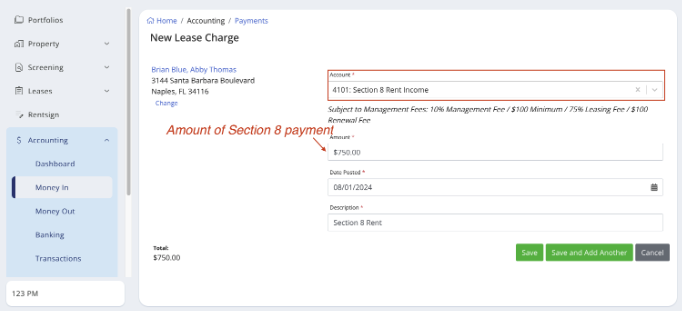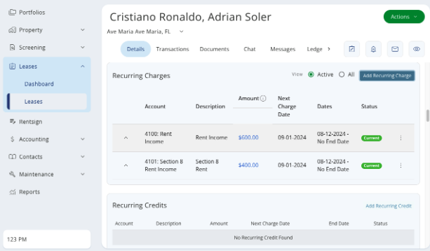Please note that you can also create recurring charges for both the normal rent and the Section 8 rent charge, so this posts every month. For the section 8 rent charges, you can have this post at a date later than the 1st, so the tenant doesn't see that as a balance due to them, and will allow time for you to receive the section 8 payment. Please refer to this knowledge base article for additional information on adding recurring charges.