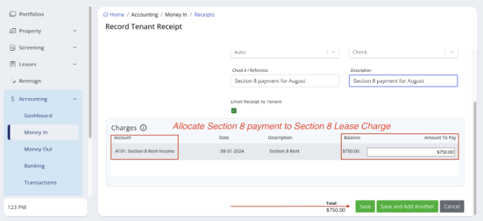 2. Record a second rent Lease Charge for the amount the Section 8 payment will be covering using the Chart of Account created from the beginning of the article.