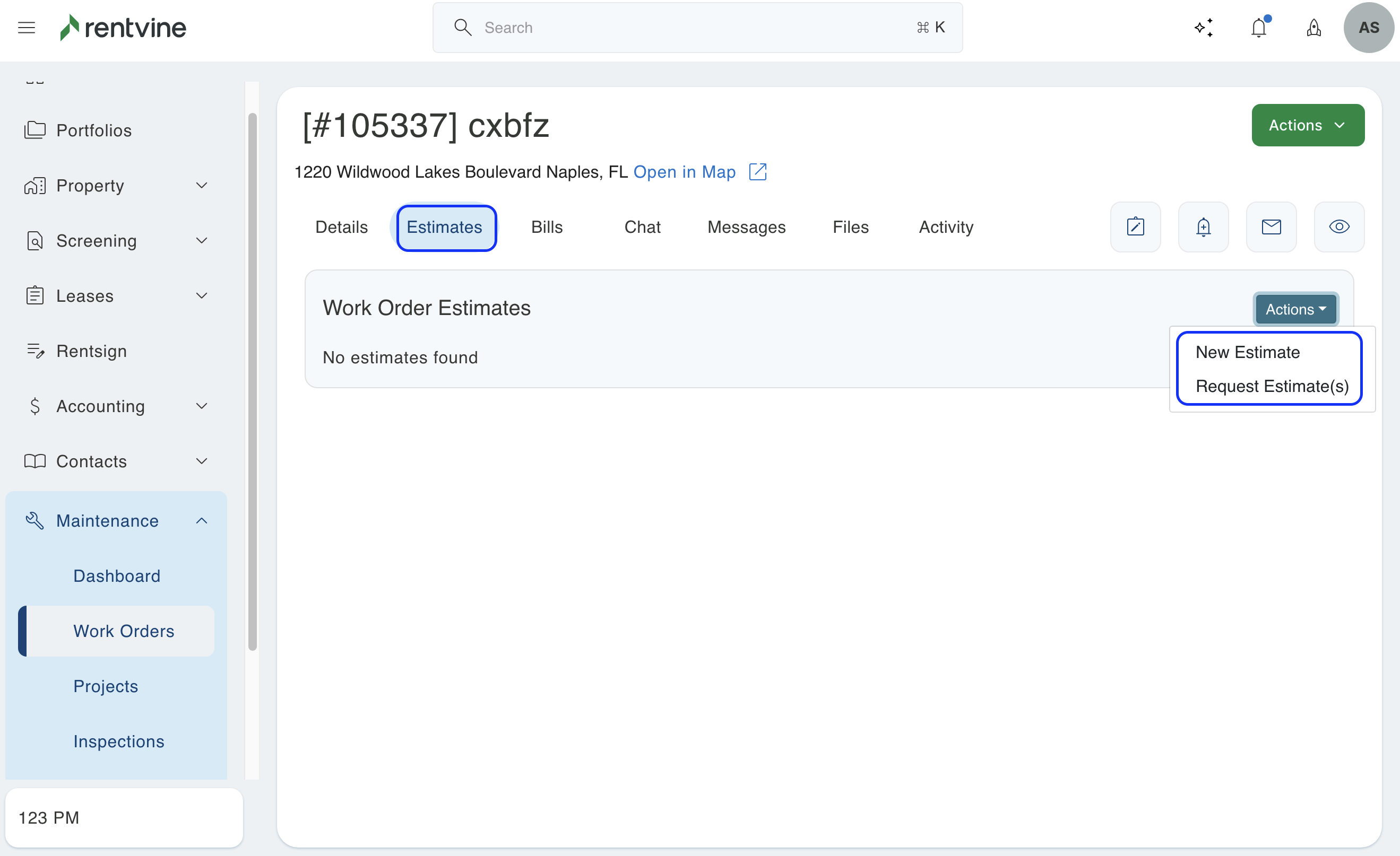 - If you go into an individual work order within the system, you will see the "Estimate" tab to record and manage estimates for a work order. In here, you can click on the actions button, and you have the option to record an estimate or request estimates.
