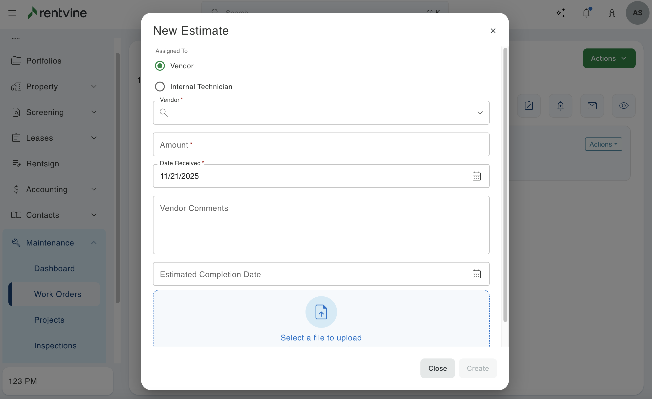 - If you select "New Estimate," this will be a way to record an estimate that you received from a vendor. You will have the option to choose the vendor this estimate is from, the amount, the date received, any comments, the estimated completion date, and any pertinent files you would like to upload.