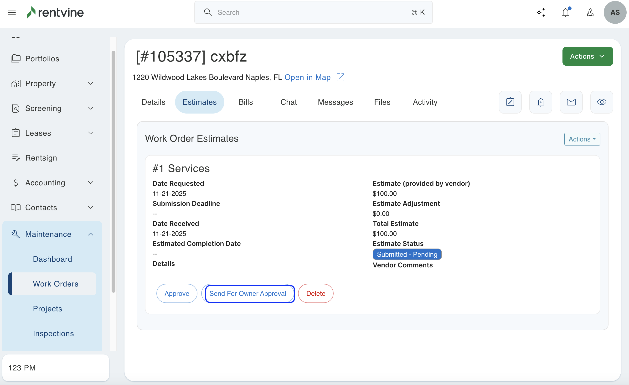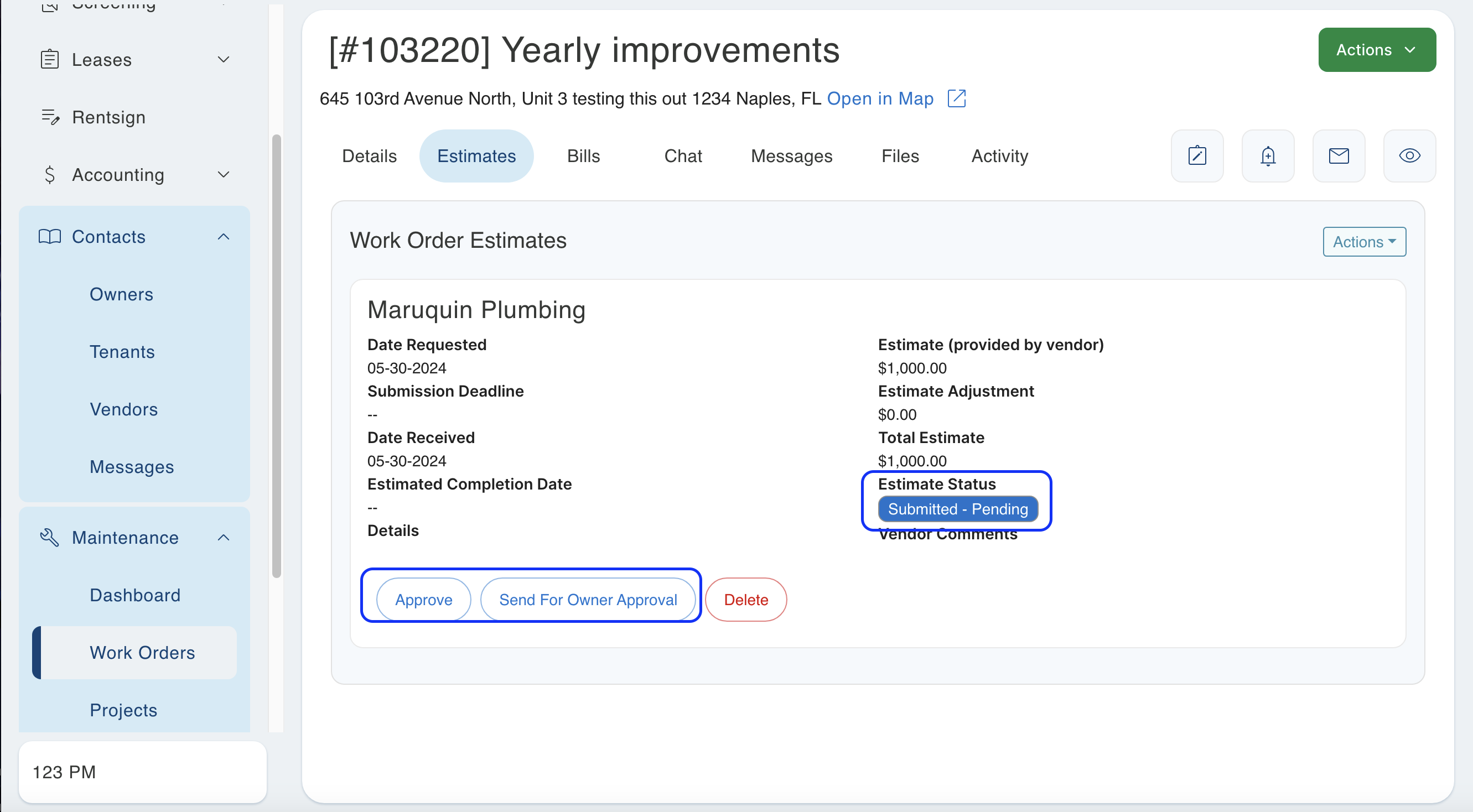 - Once this is created, you will have the option to send this to the owner for approval, or you can approve it directly. Once approved, the total estimate amount will be established as the work order estimate cost, and the vendor will be assigned to the work order.