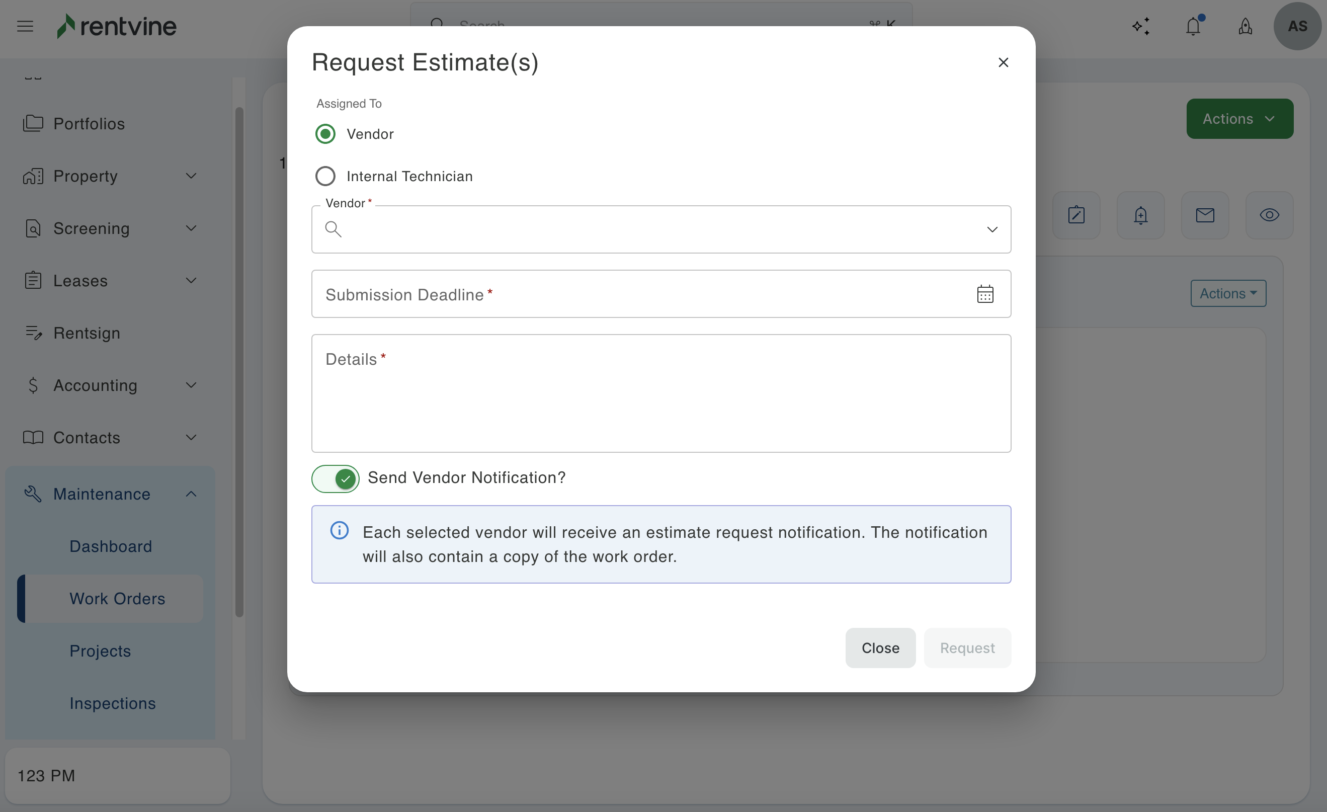 - The other option you have from the work order estimates tab is to request estimates. If you select this option, you will be able to choose multiple vendors that you would like to send an estimate request to. You will also be able to select a submission deadline, any extra details, and select if you would like to notify the vendor that a request was sent to them. Once you click request in the bottom right, it will show the requests submitted. You'll be able to view the status of the estimate.