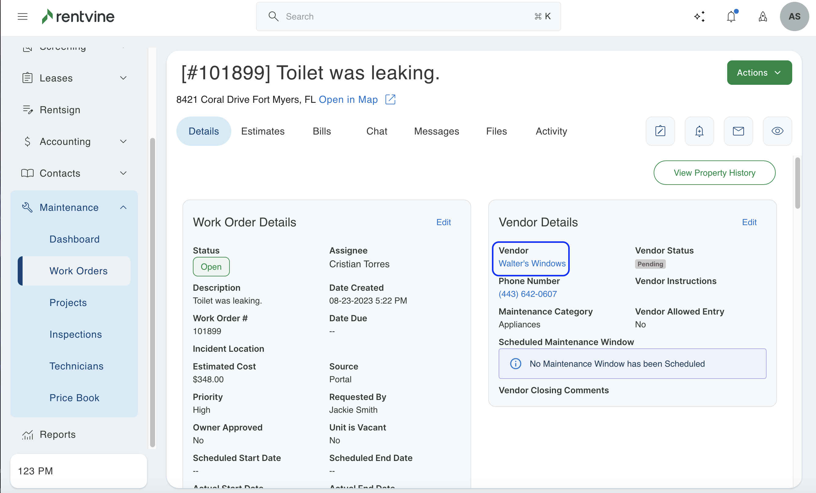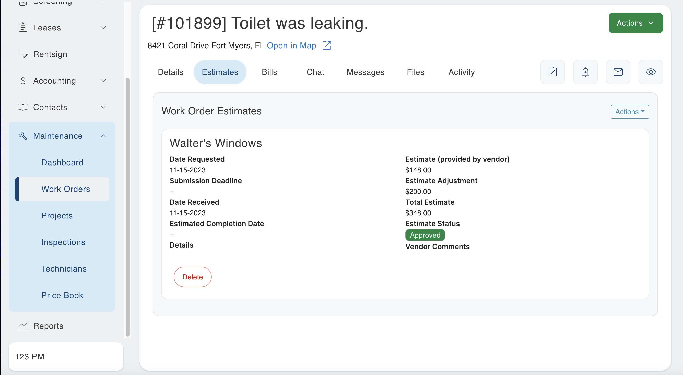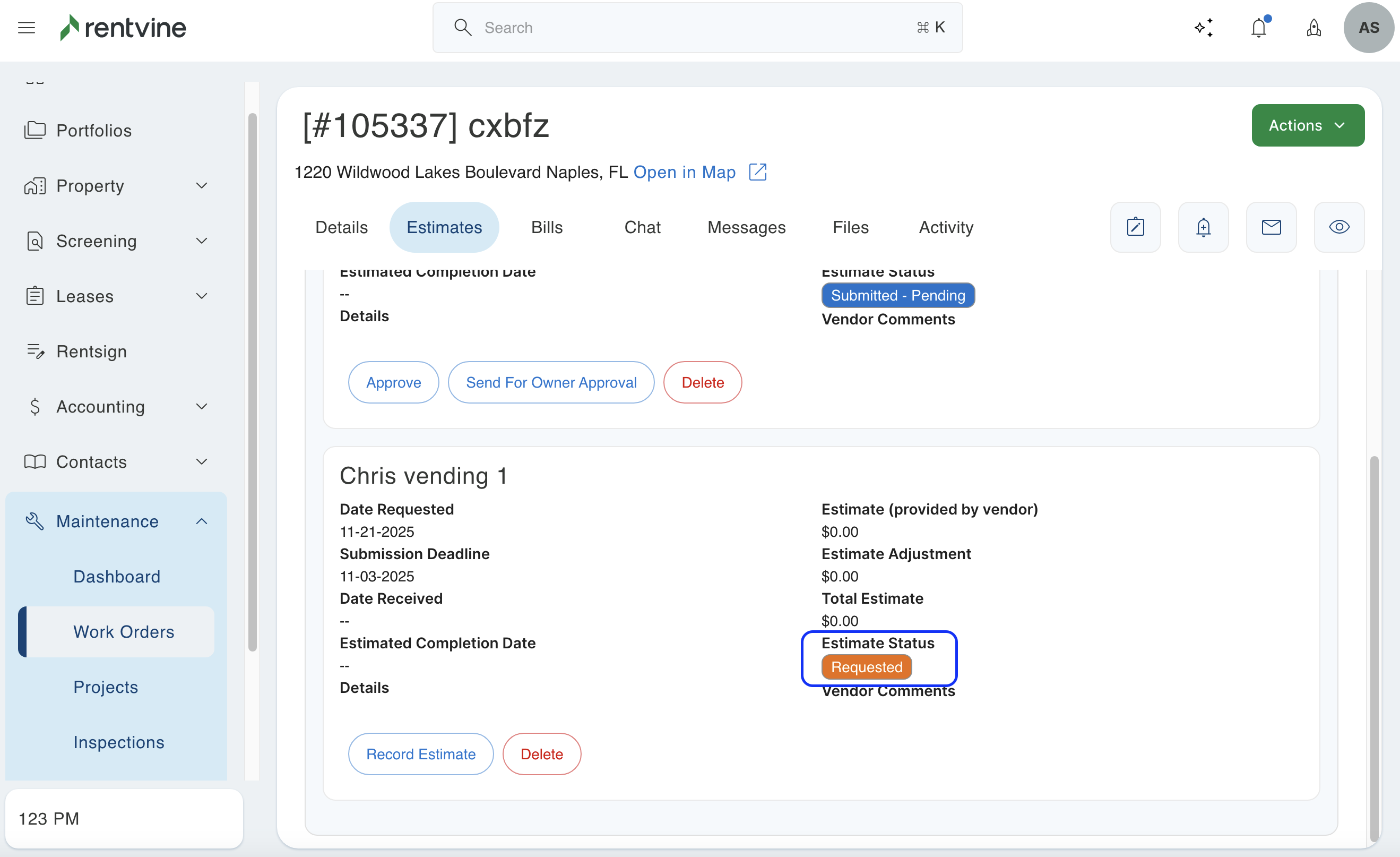 - Once that is done, you will see that the status has updated and automatically approves the estimate for you. You will notice that the vendor that submitted the estimate is automatically set as the assigned vendor on the work order. The estimated amount is also automatically set as the estimated cost on the work order upon owner approval.