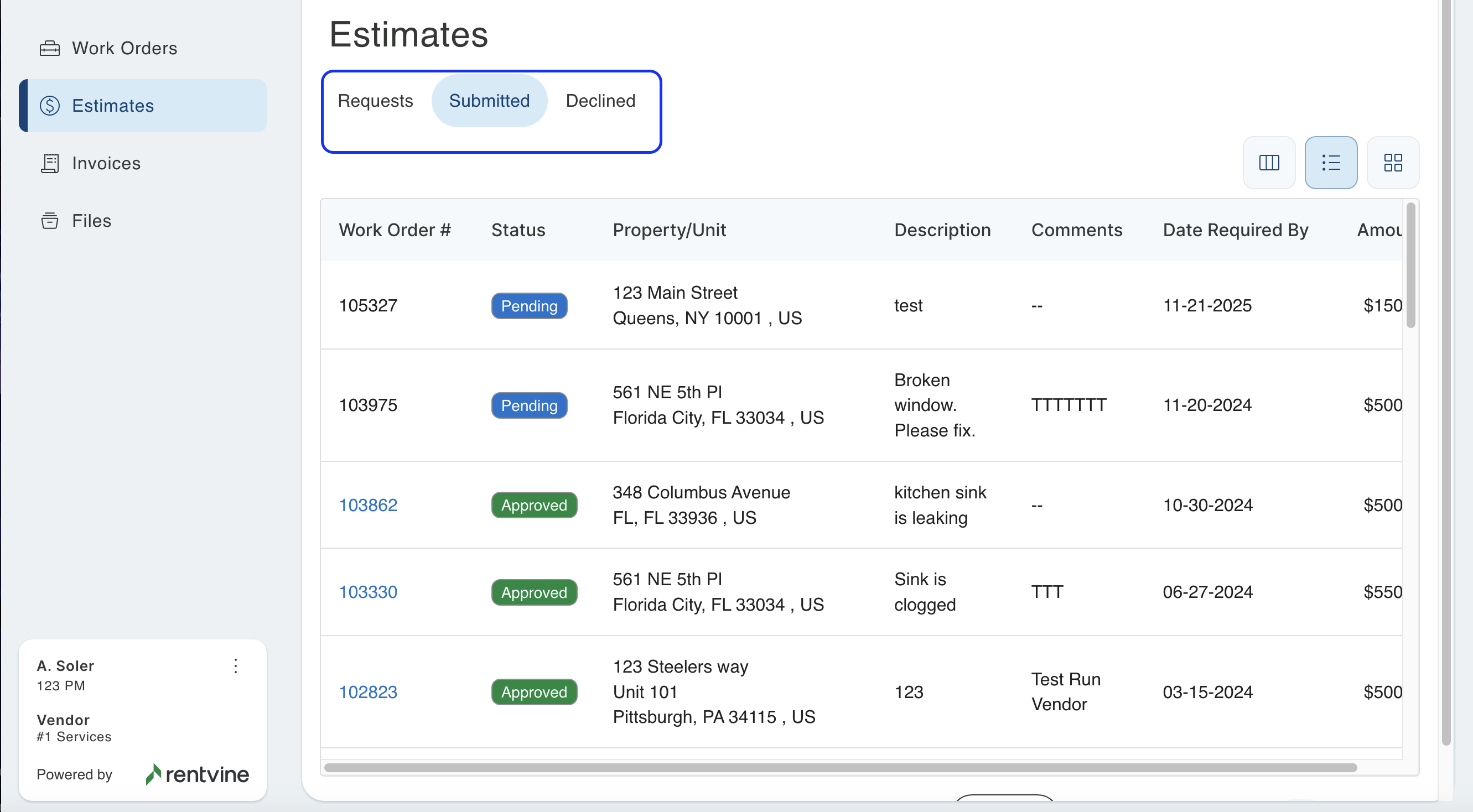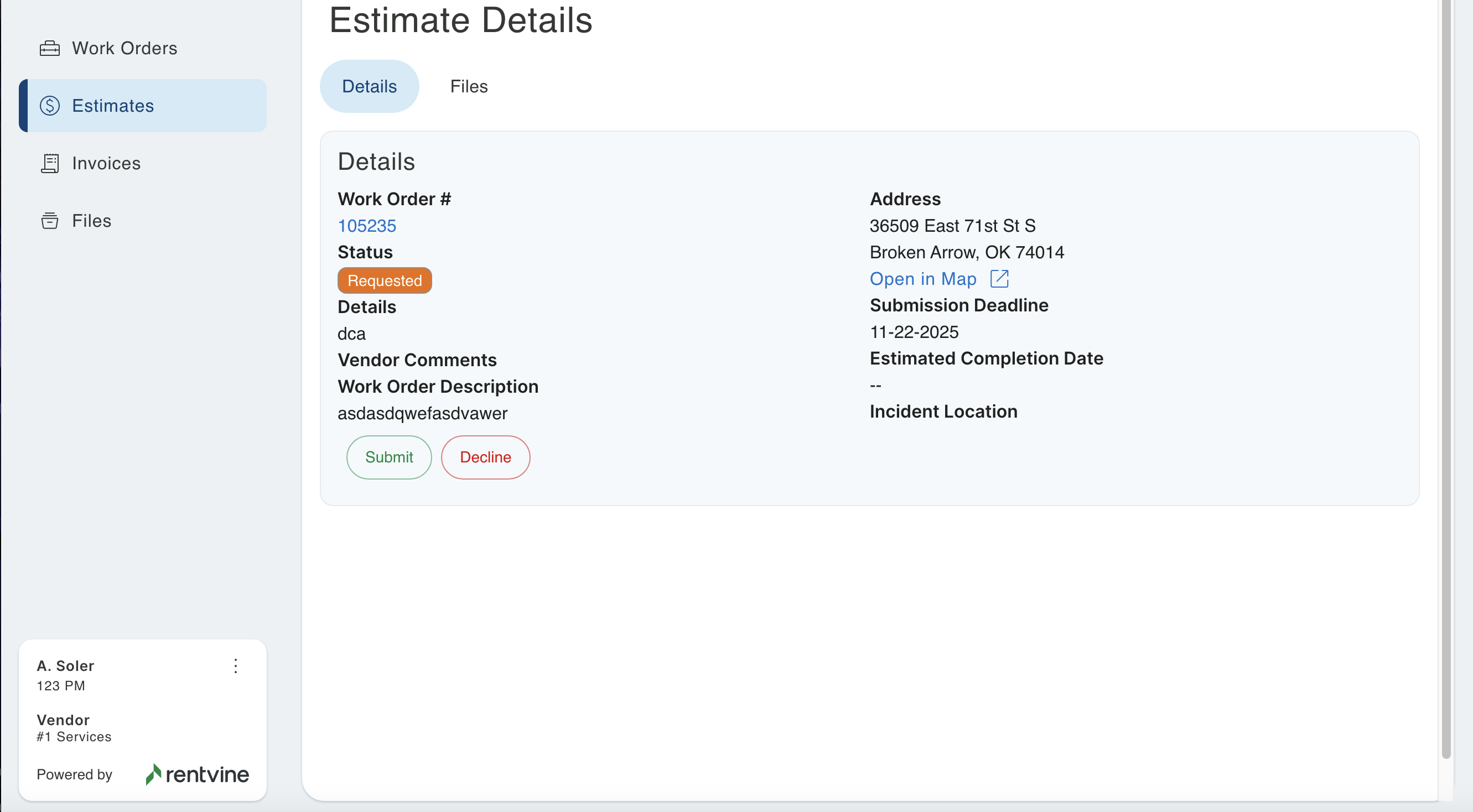 - Hopping over to the vendor portal, you can see what the vendor sees during this process. The vendors also have a new tab in their portal dedicated to just estimates. In here, the vendor will be able to see any current requests, all submitted requests, and any declined requests. When the vendor clicks on the current request, they can either submit the estimate or decline it. If they want to submit an estimate, they can enter the amount, any comments, the estimated completion date, and any files they want to include. Once they click submit, it will send it back to the manager.