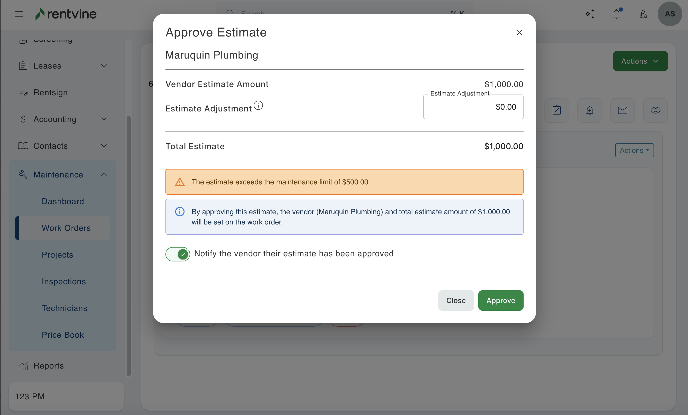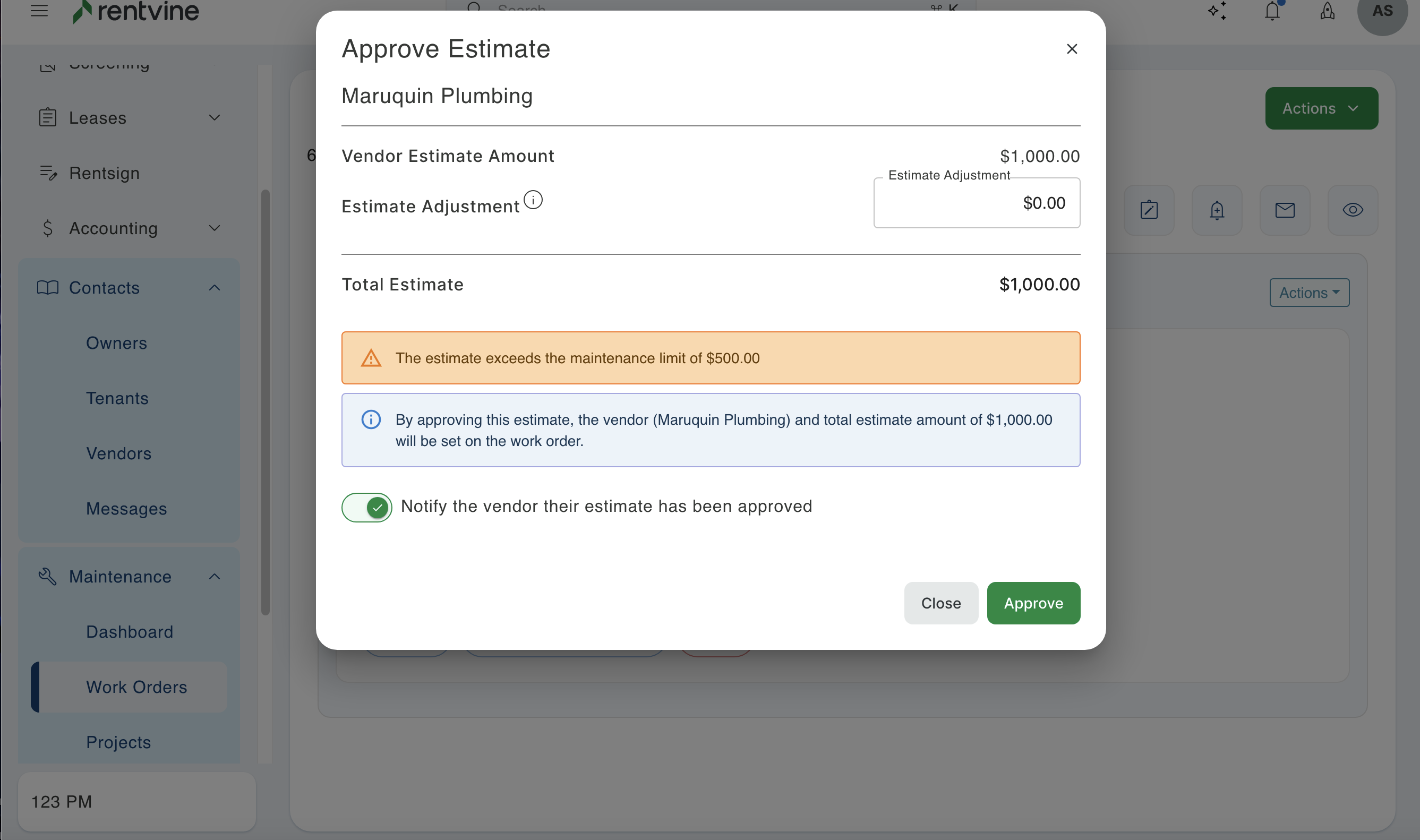 The last option you have here is if you approve the estimate without owner approval. There is an option to notify the vendor that their estimate has been approved. If this is toggled on, the vendor will receive an email notification that this was approved, and it will also appear in their approved tab on their portal. Once you click approve, you can go back to the main details page of the work order, and you will notice that the vendor that you approved the estimate for will automatically be the assigned vendor for this work order. This will also automatically set the work order estimate cost.