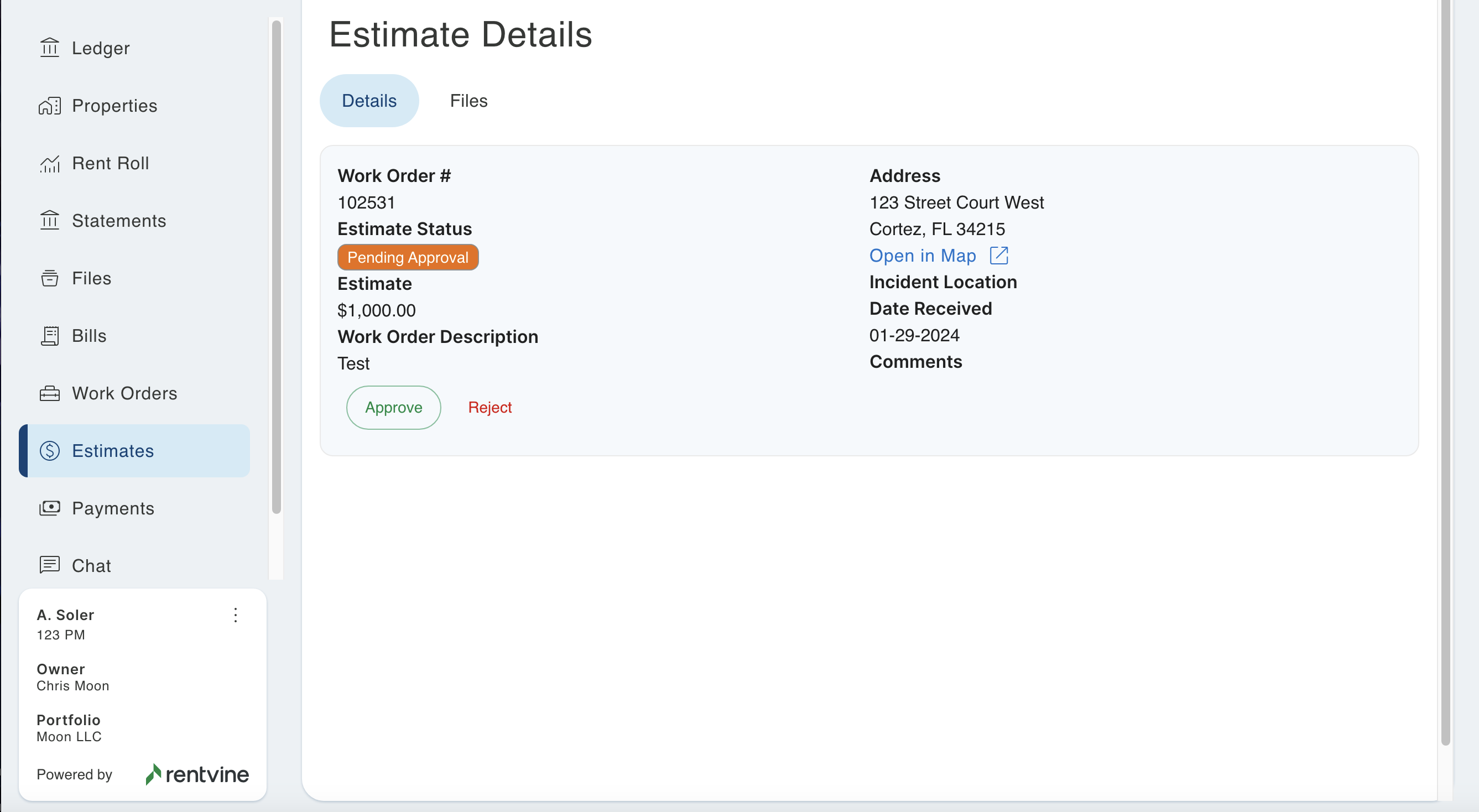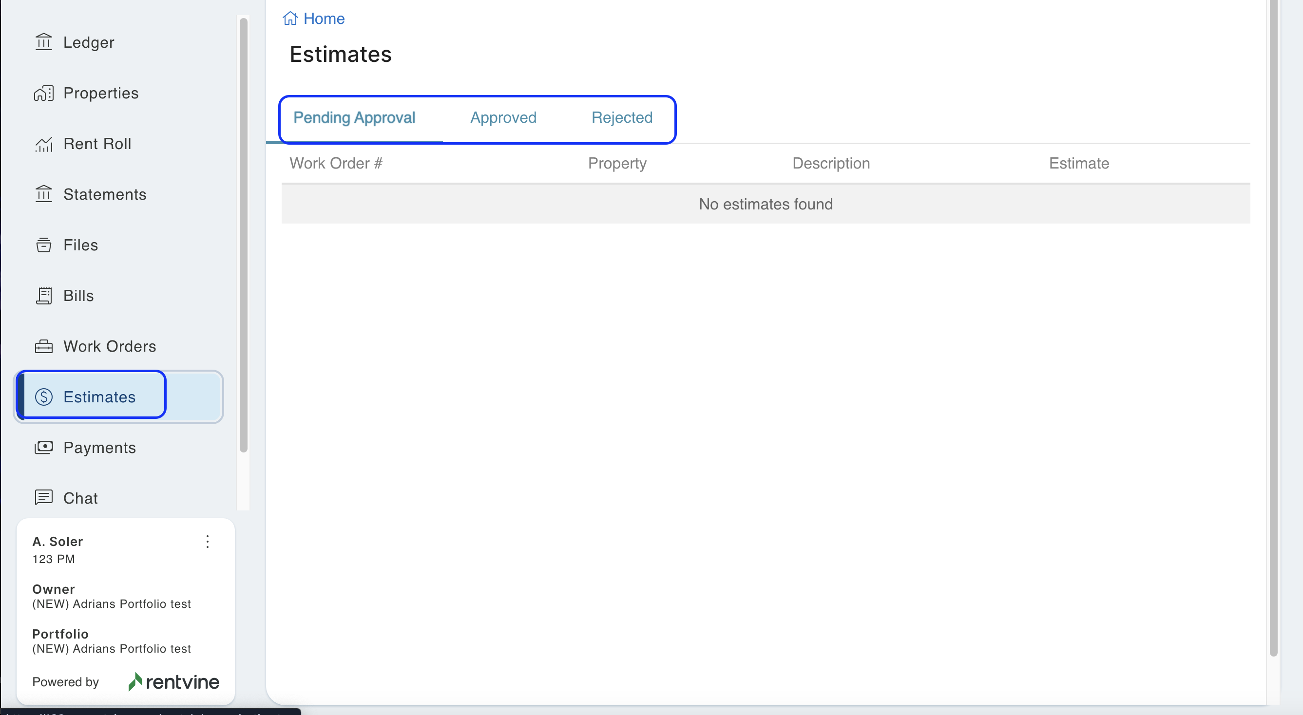- Viewing the owner's side of things from their portal, you will see that they now also have an estimates tab just like the vendor. It will be very similar to the pending approval tab, approved tab, and rejected tab. If you click on the pending approval, you will see the owner has the option to either approve the estimate or reject the estimate. Once this is either approved or denied, it will update on the manager side. I will approve this one and then head back over to the management side.