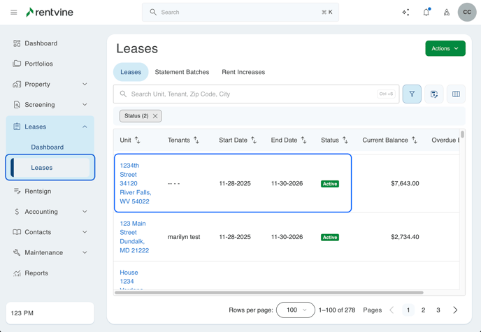 - You can also search for the tenant, property, or lease in the global search, then click on the lease.