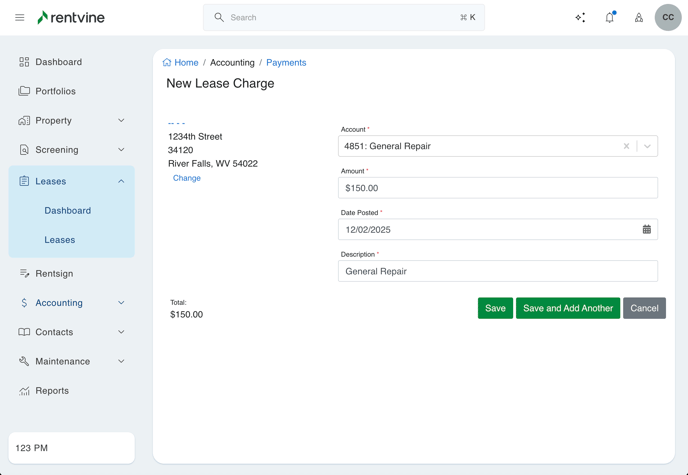 - Click Save, or Save and Add Another to add multiple charges.