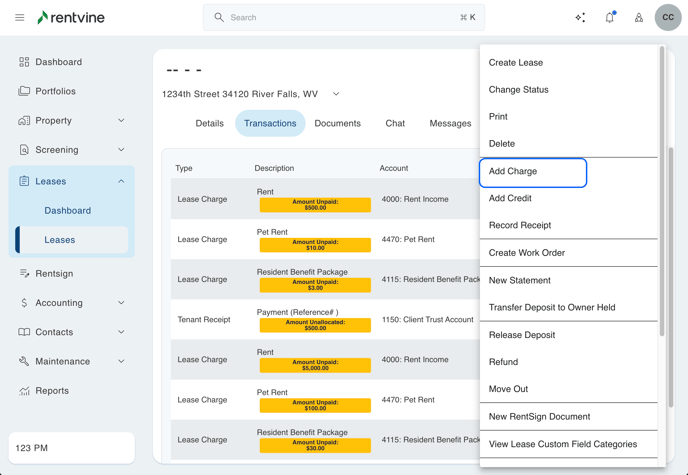 - While in the lease, to add charges, click on the green Actions button, and then click on Add Charge