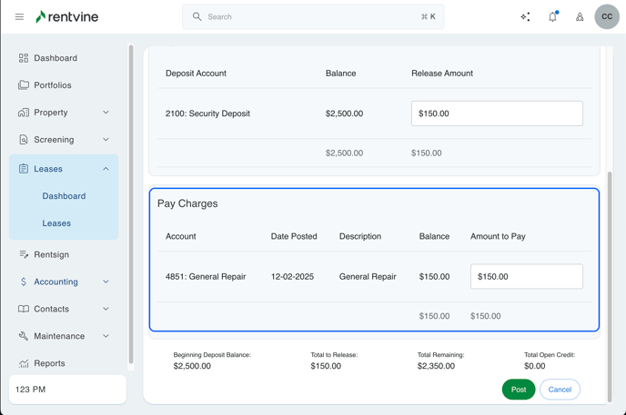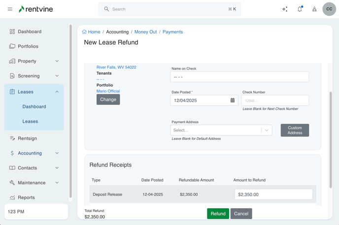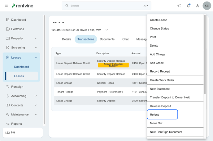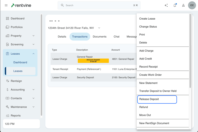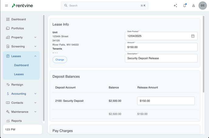 This article will walk you through the process of releasing a security deposit and/or paying move-out charges with the security deposit. Then, refund any remaining amount to the tenant.