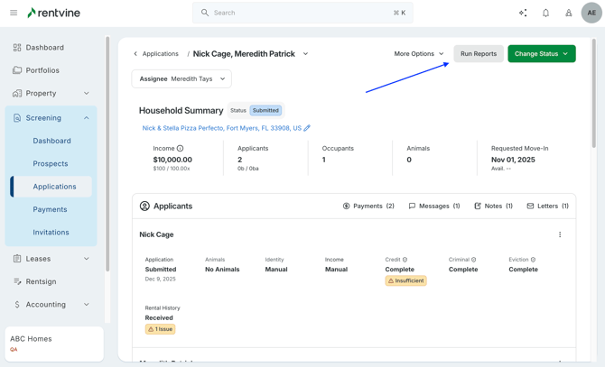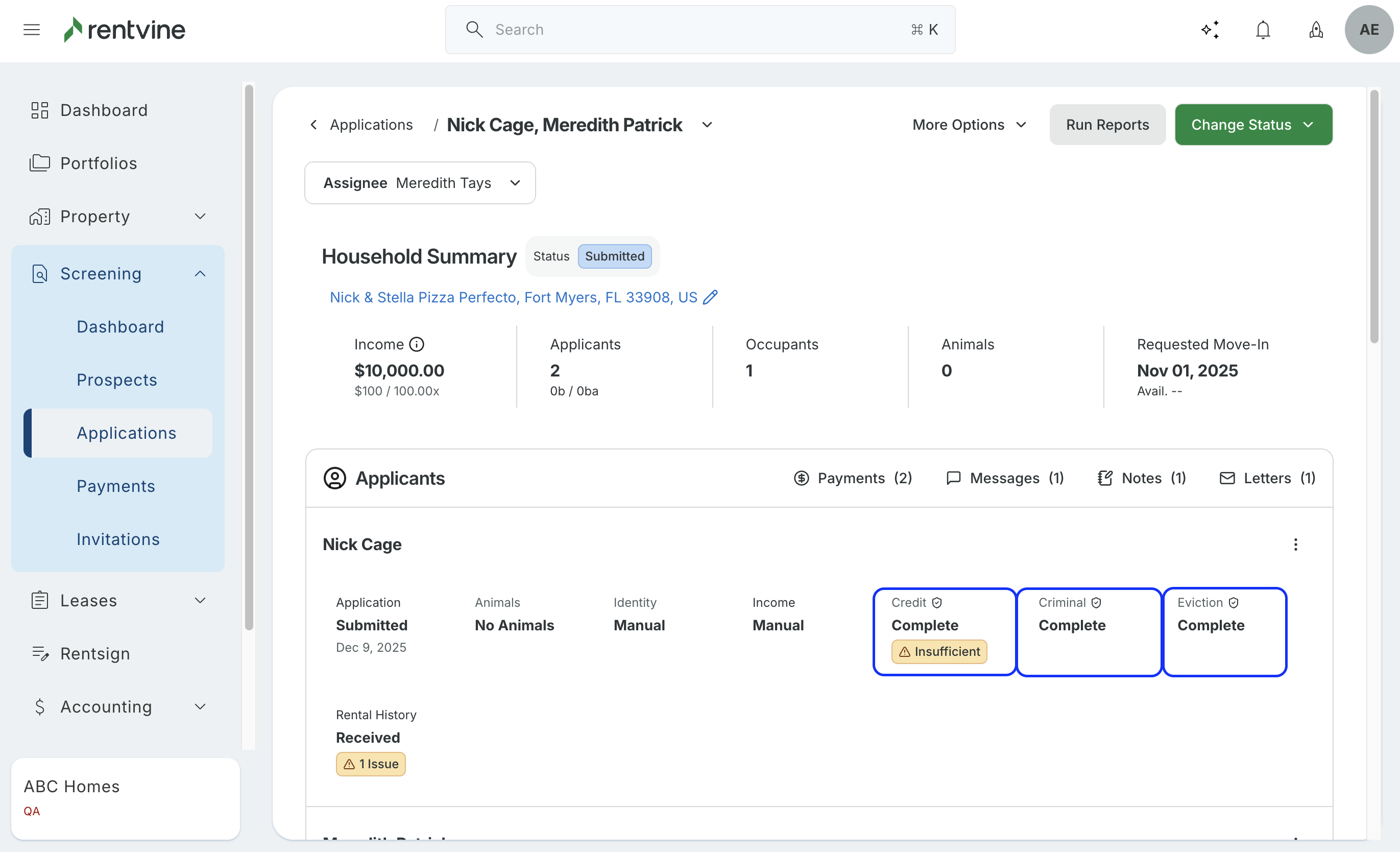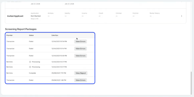 • Our system will then integrate with TransUnion's screening system to process the applications. You will see a Screening Report Packages under the applicants information. Under the Status Tab, it will show "processing" until all the reports have been pulled successfully.