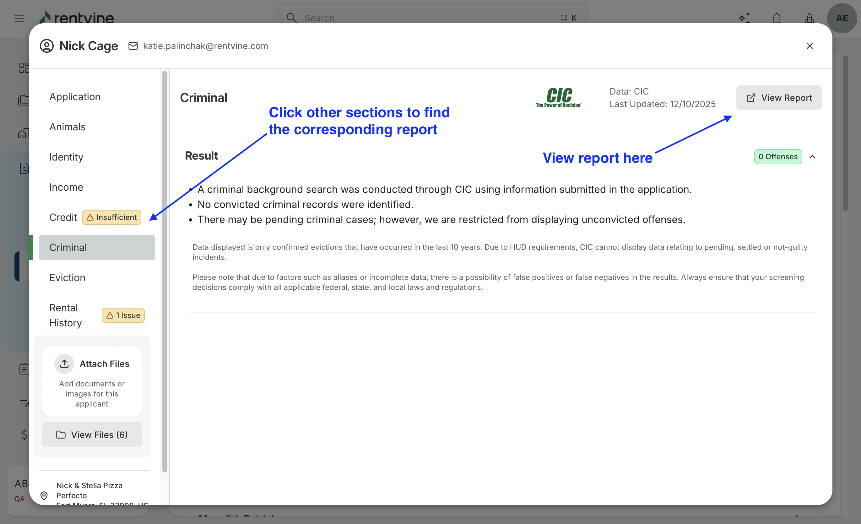 • You will click the Credit, Criminal, or Eviction section within the Tenant Details section to navigate straight to the specific report