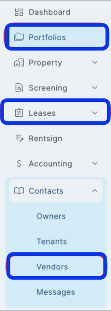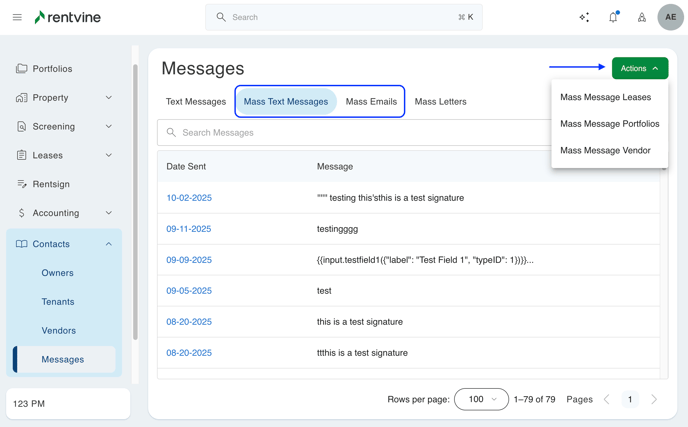 You can also start a new mass message from the Portfolio Tab, Leases Tab, or Vendor Tab from the left navigation menu. Then click on the Green Actions button and select Mass Message