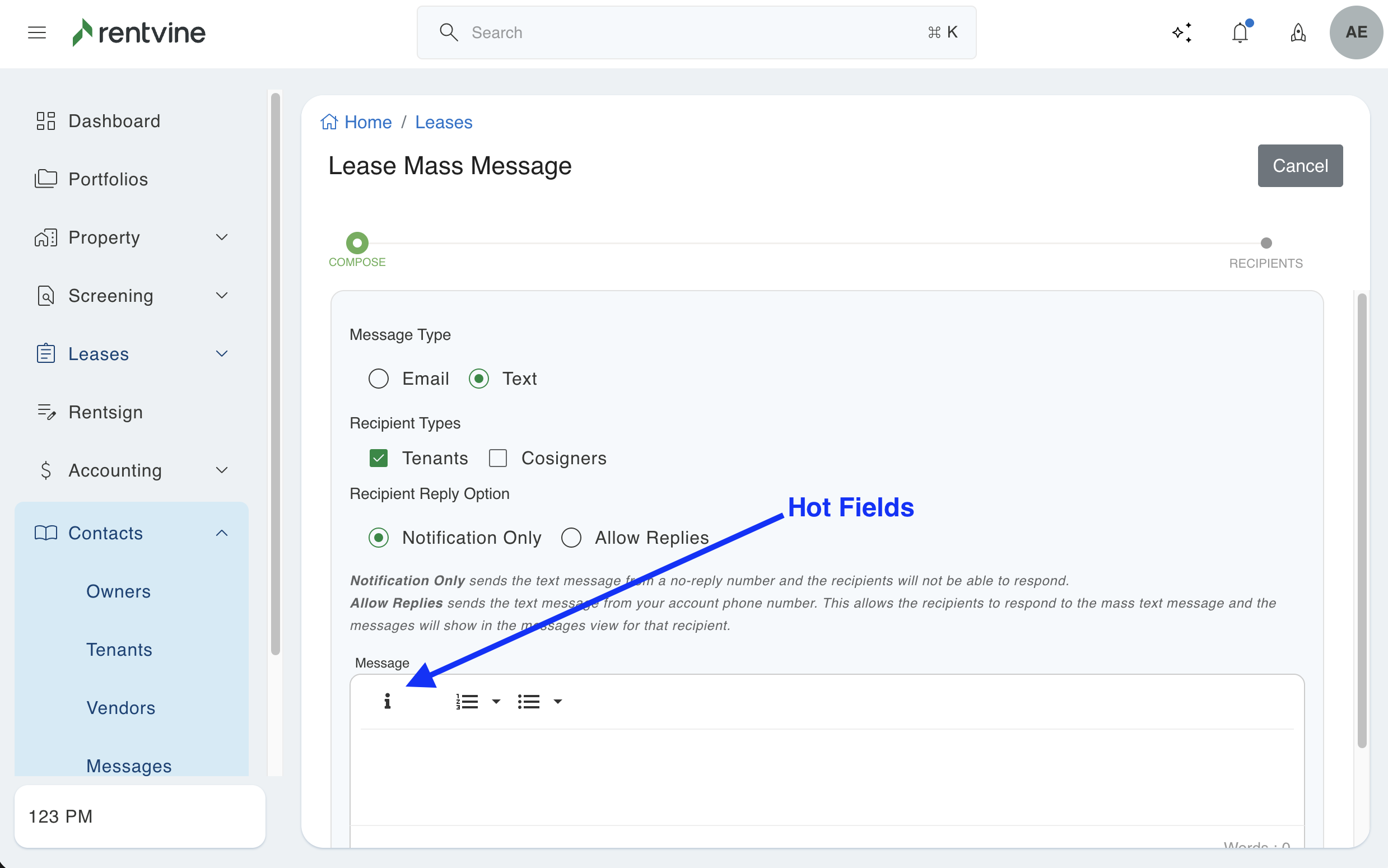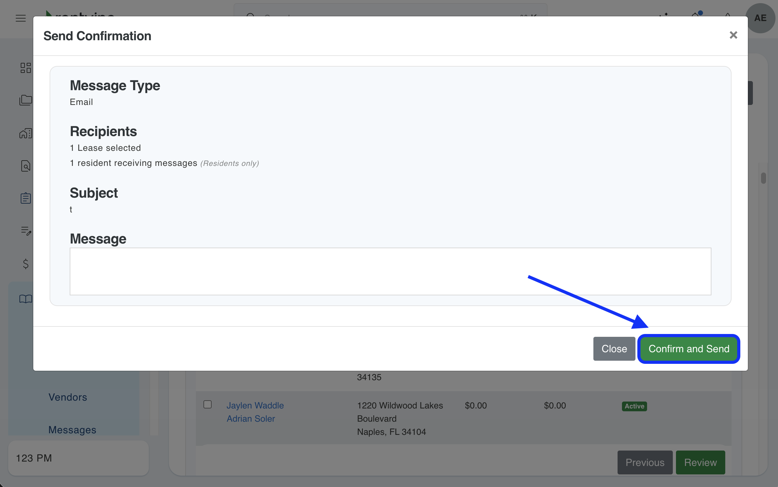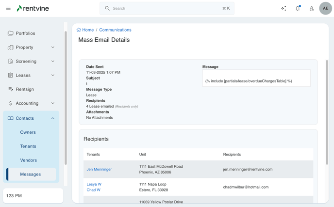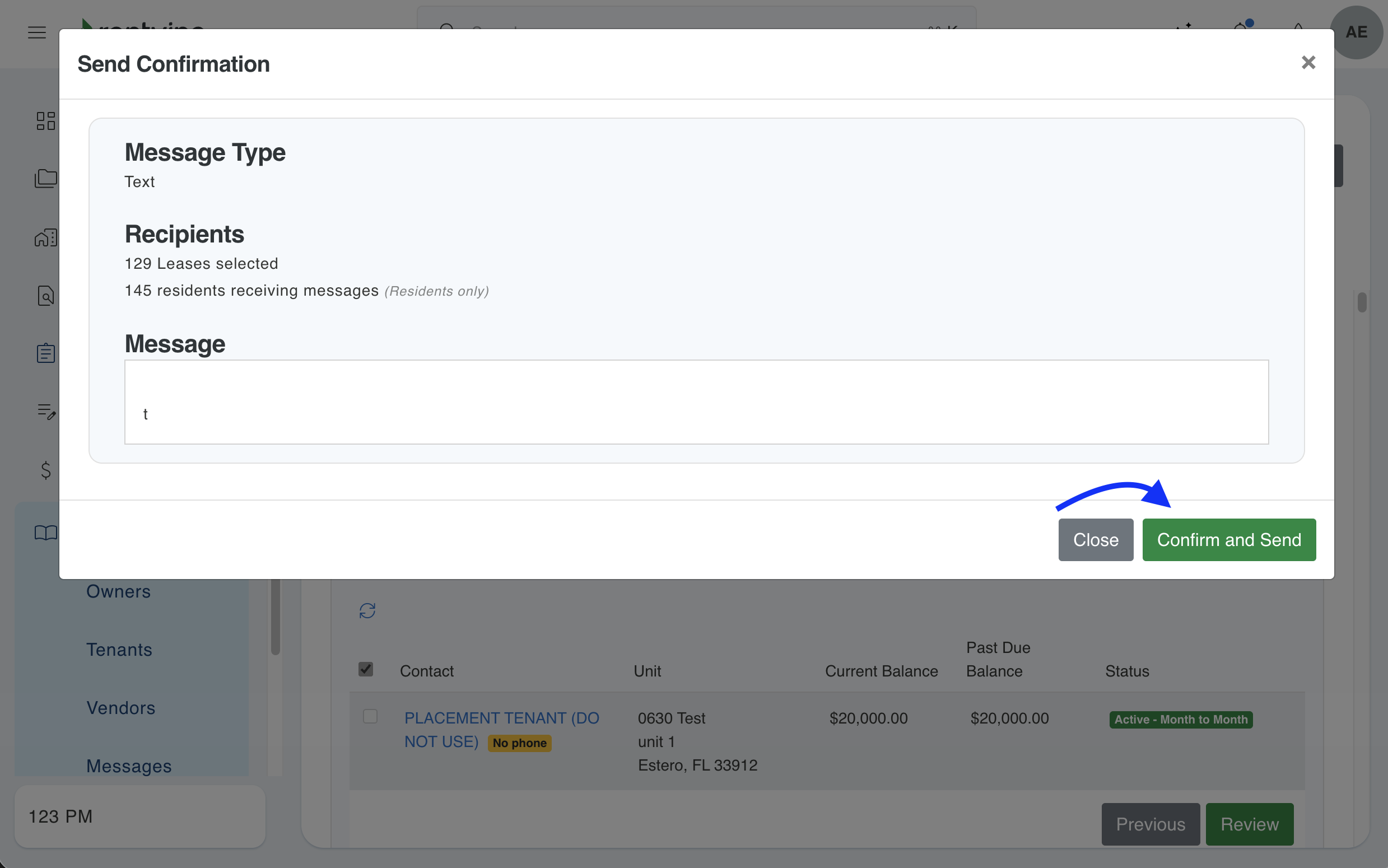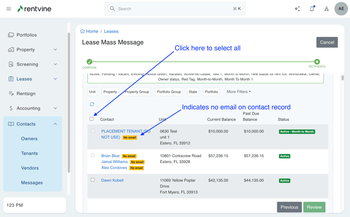 This article will show the process of sending a mass email or text message out to multiple recipients and optionally filter the list of recipients based on certain criteria. You can send a mass email or text to select tenants, owners or vendors