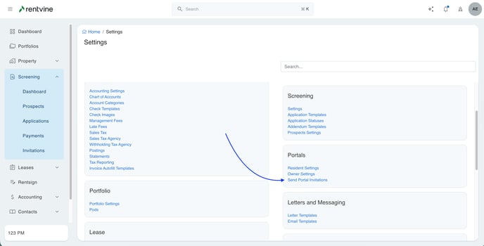 • Under ‘Portals’ on the right side, click on Send Portal Invitations. See below