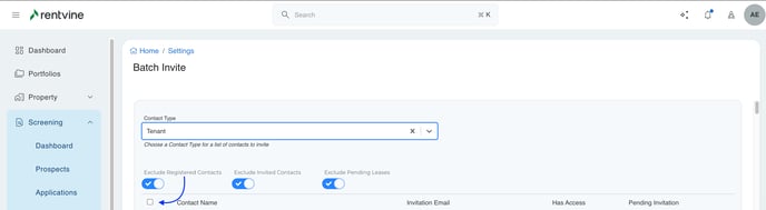 • Rentvine will automatically check the options to exclude Registered Contacts, Exclude Invited Contacts, and Exclude Pending Leases. You can uncheck any of these options if you would like to