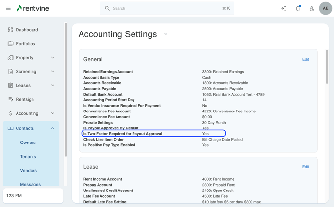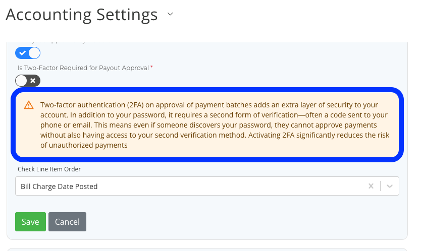 - You can also control whether you want to require two-factor authentication for all payouts. From your global settings, you can click on accounting settings. Under General, there is an option to enable "Is Two Factor Required for Payout Approval". If this toggle is on, you will be required to enter the MFA code that is sent to either your phone or email. This is to add an extra layer of security so every payout uses MFA before being sent out.