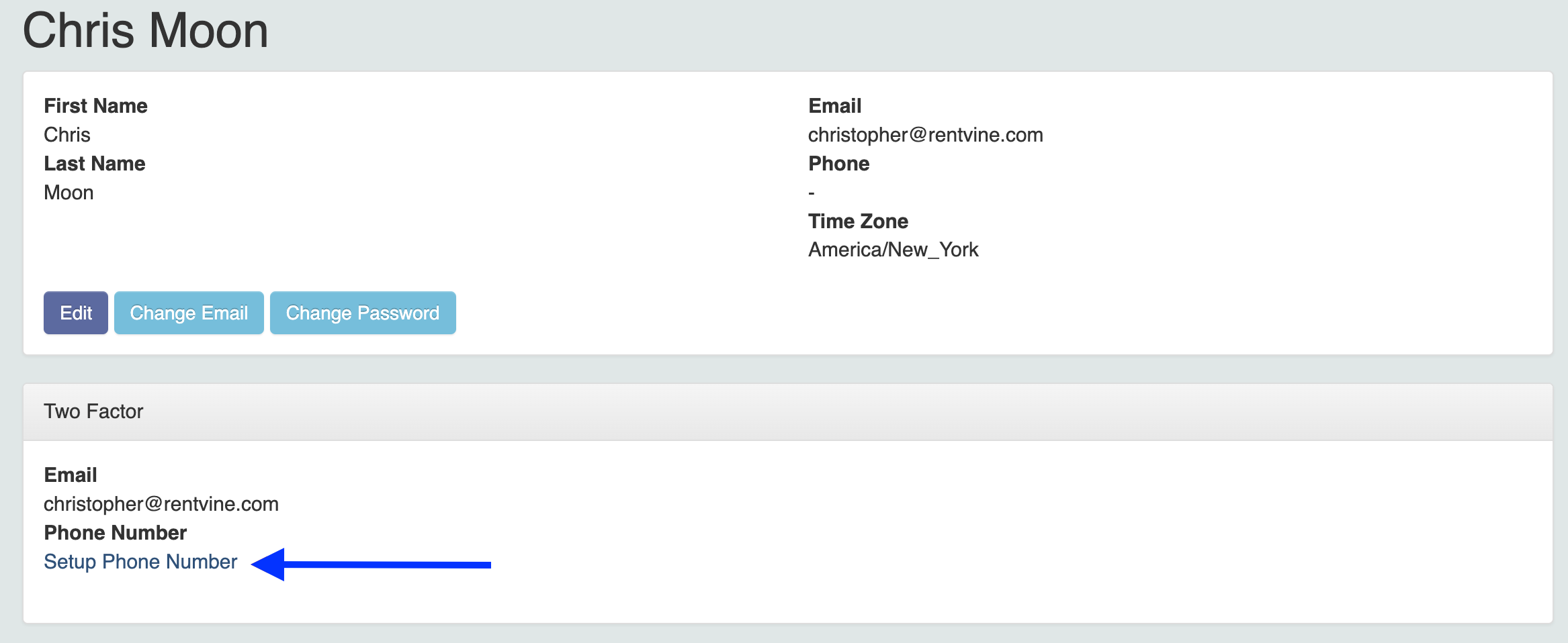 - From here, you will be able to click on "Setup Phone Number" under the Two Factor box.