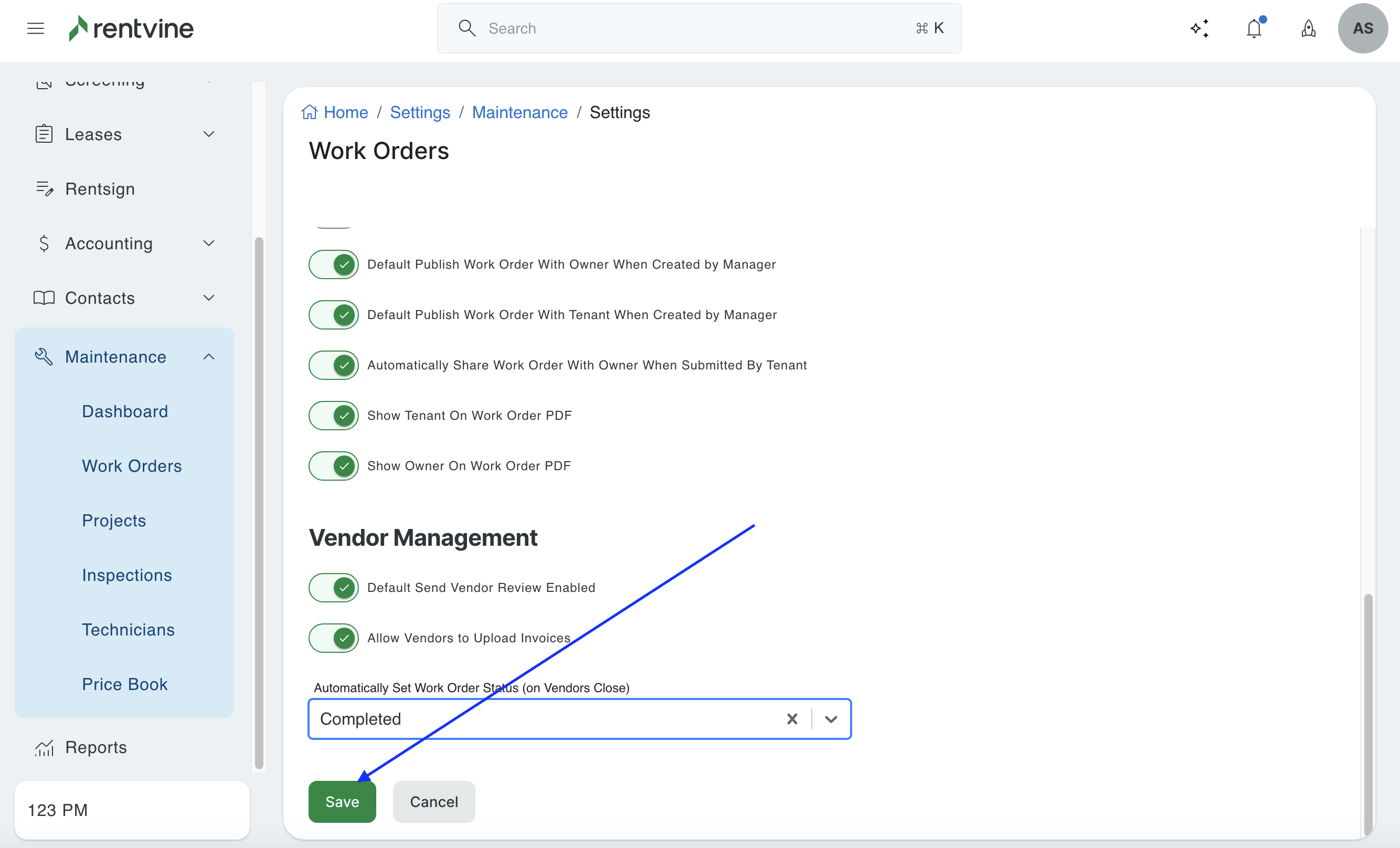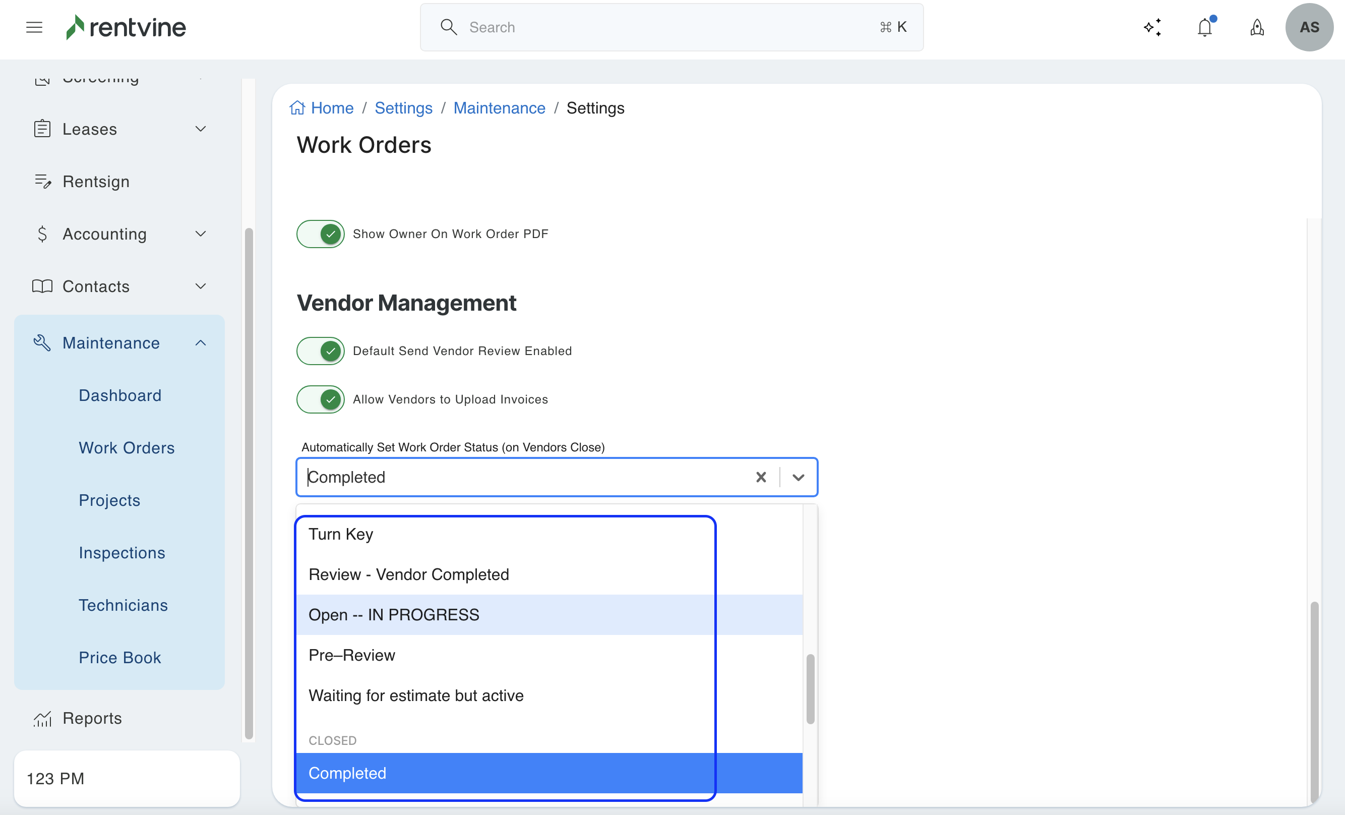 - Once the Work Order Settings come on, you are going to see the domain that says Automatically Set up Work Order Status (On Vendor Close). To select which status you choose, please select the dropdown and select the desired status.