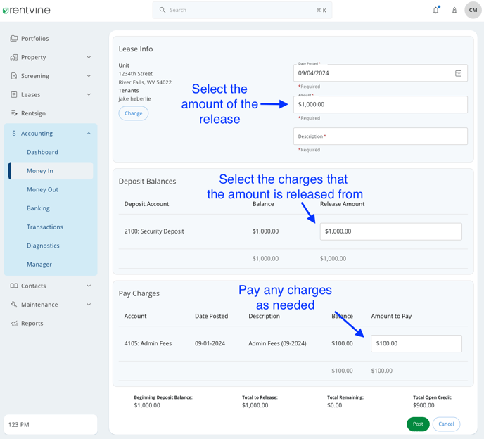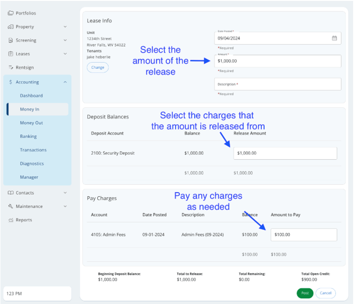 3.) In this screen, you will fill out any necessary information, like how much of the deposit you want to release and any charges you would like to pay with the security deposit, if applicable. Make sure to click the green post button to release the deposit.