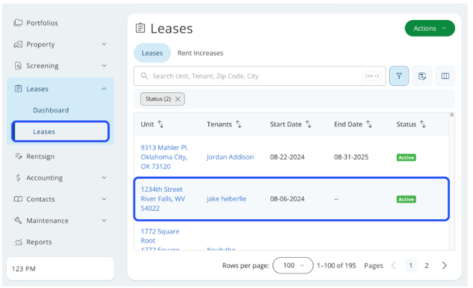 1.) To begin, click on the "Leases" tab located on the left side of your screen. Next, search for the specific lease associated with the security deposit that you wish to split.