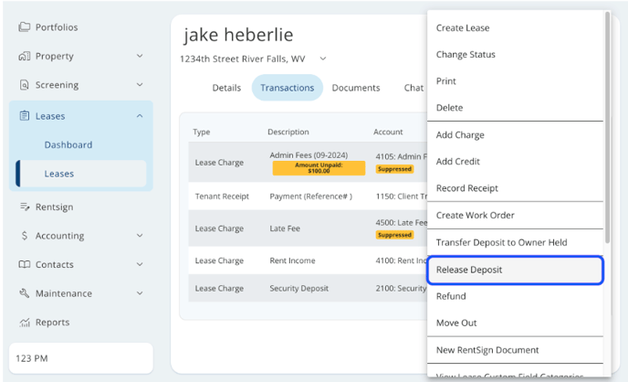 2.) In this lease, you will need to click on the green actions button in the top right. This will access a dropdown, and you will click on "Release Deposit".