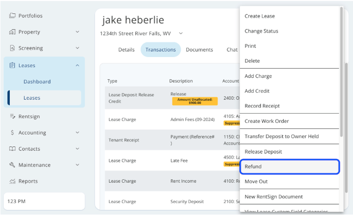 4. Next, you will return to the same lease and click the green actions button again. You will then click on the button labeled "Refund".