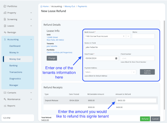 5. This will pull up the refund page. In here, you will fill out all the information for a single tenant who is a part of the lease. When you are done in the refund receipts section, you will put the amount that the tenant is getting from the security deposit. Make sure to press the green Refund button to post the refund. It will be refunded as a check.