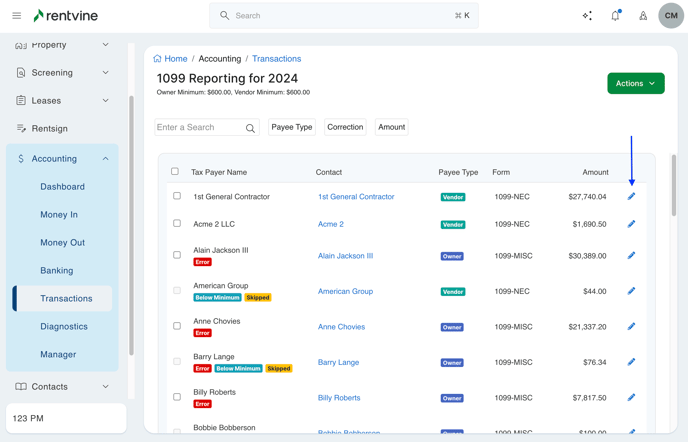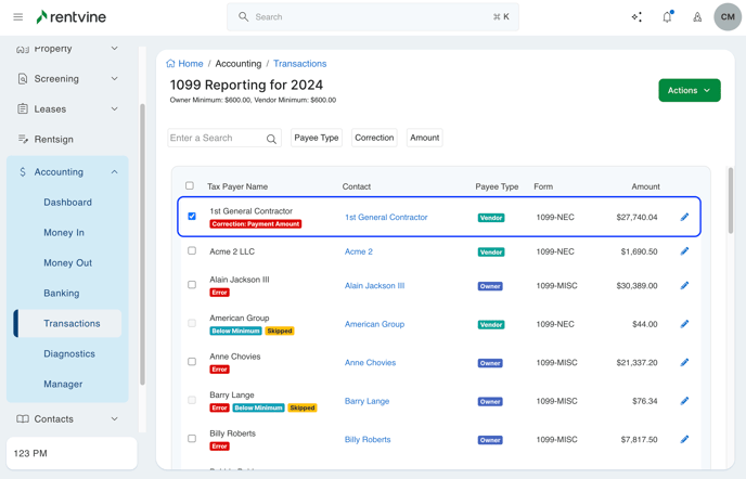 Under Tax Reporting, you will see a list of Payees for the current reporting year.