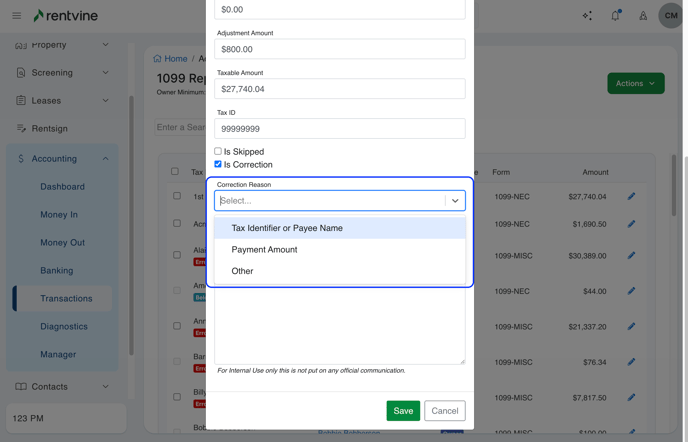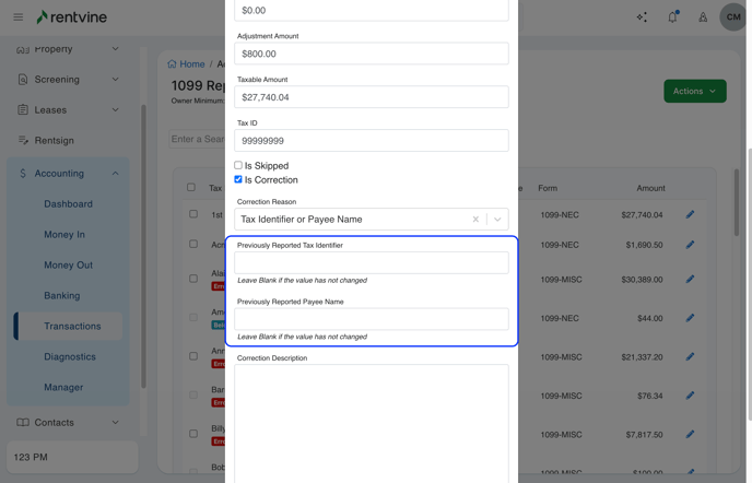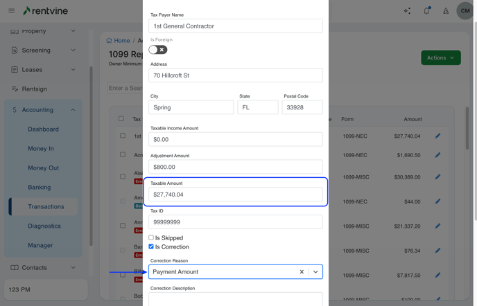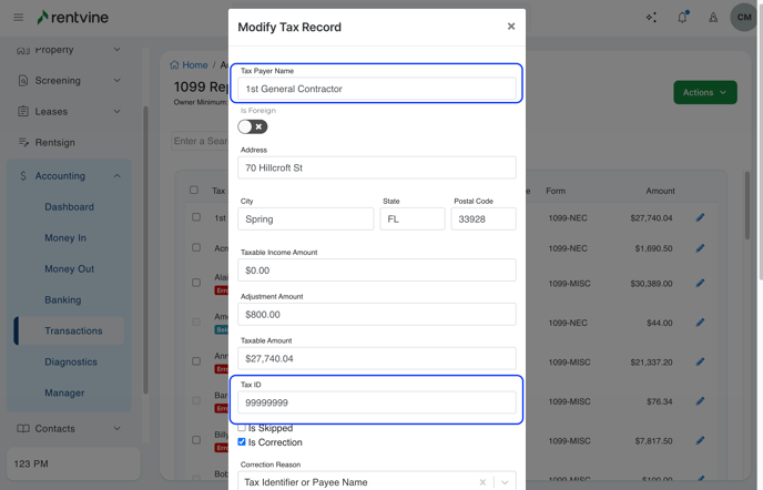 Once the information above is completed, please update the Payee name and Tax-ID with the new corrections that will be reported to the IRS in the fields above the Correction Reason drop-down.