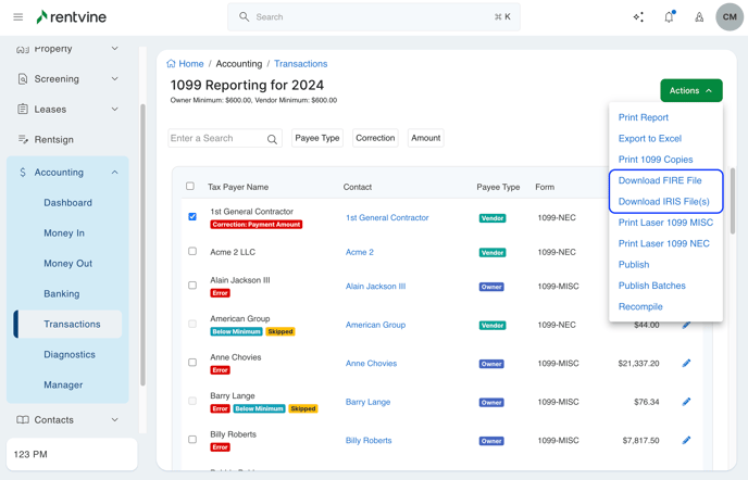 Lastly, select Actions>Download FIRE File or Download IRIS File. This will generate a FIRE file or an IRIS file that can be used to upload to the IRS. It will download to your device locally.