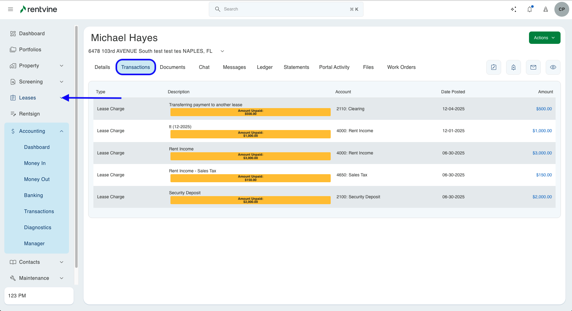 - Next, navigate to the Transactions tab on the same lease that has the payment that you want to transfer.
