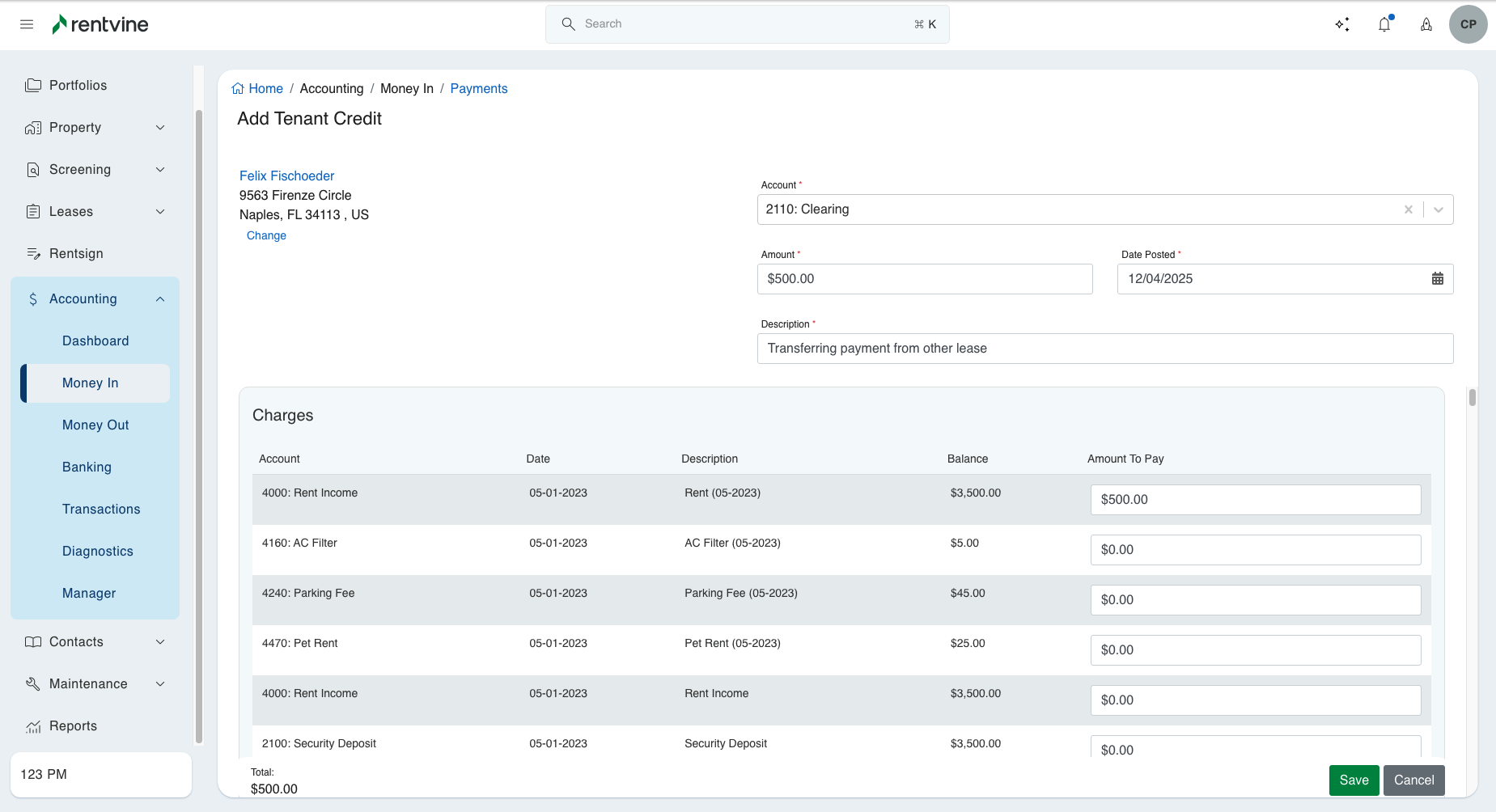 - Amount to Pay - If the lease has unpaid charges, you will have the option to apply this credit to the unpaid charges. Enter the amount as needed.