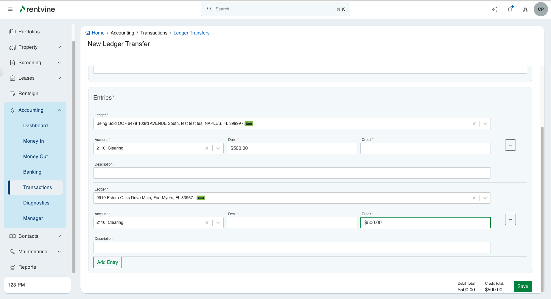 - Lastly, create a ledger transfer to bring the clearing accounts back to zero on both portfolios. From the left navigation menu, click on Accounting / Transactions.. Then click on the green Actions button and select New Ledger Transfer. Enter the details below and click Submit.