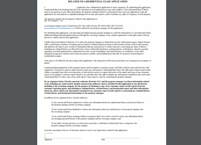 Please note that a system addendum is now attached to all applications and can not be removed. This is a consent form that the applicant must sign that allows you to reach out to the applicant's previous landlords. Below is an example of how that addendum looks (Please open this picture in another window for a better view of the full addendum).