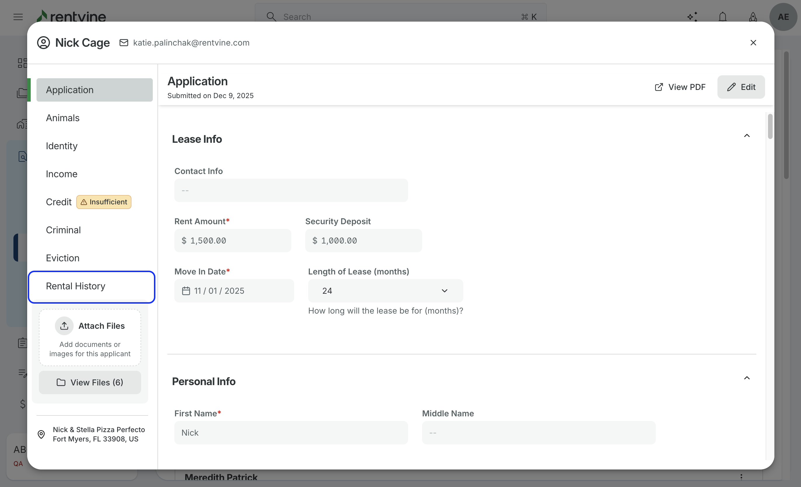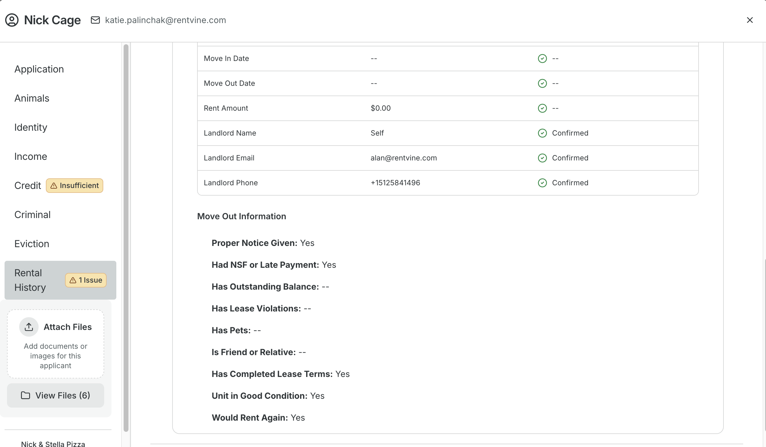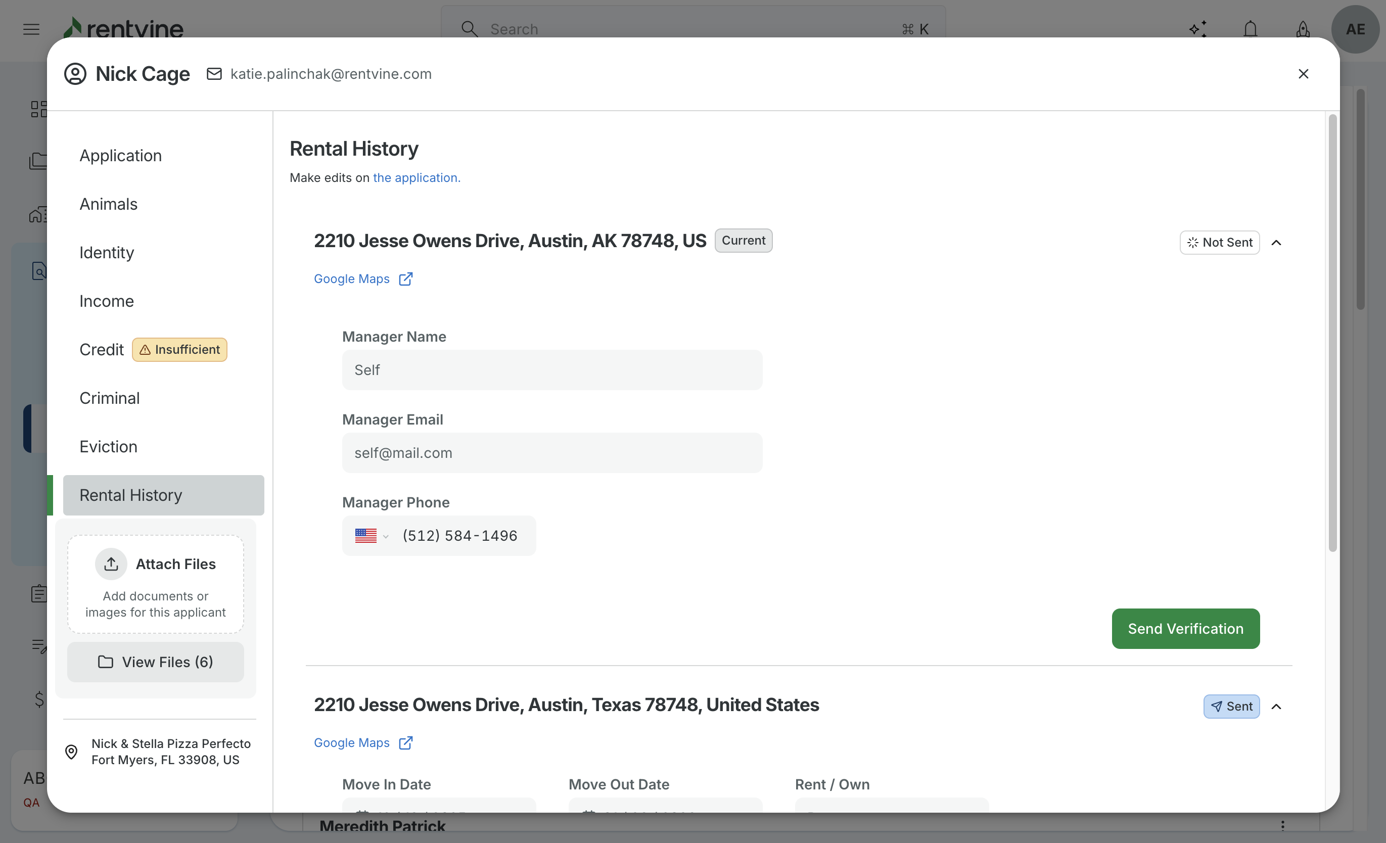 - In here, you will see the tab labeled "Landlord Verification". If those fields were filled out during the application process, you will see the information and a send button. If you click send, this will send a form of generic questions to the landlord for them to fill out.