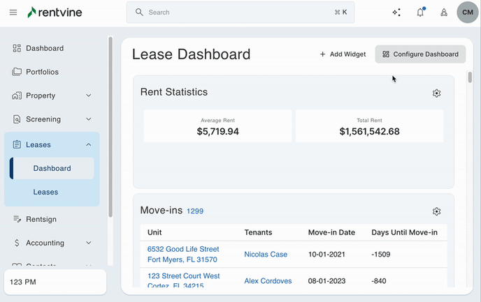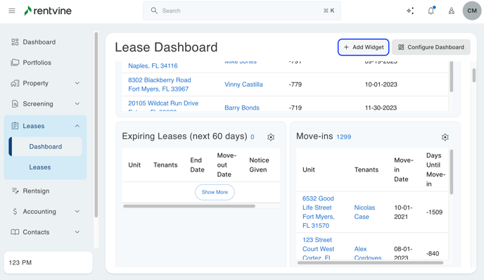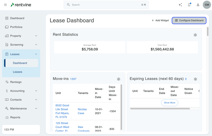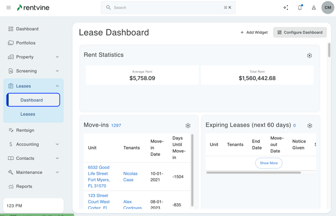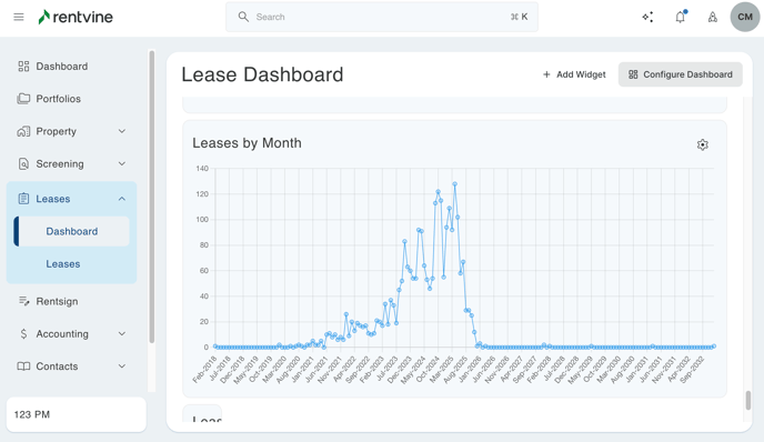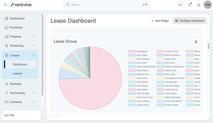 - To view your leases dashboard, you can click the leases tab and then click "Dashboard". This will show you the default leasing dashboard that you have configured. This dashboard is on a per-user basis, so all users can customize this dashboard to their needs.
